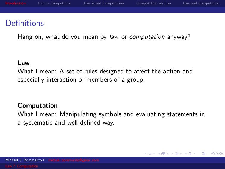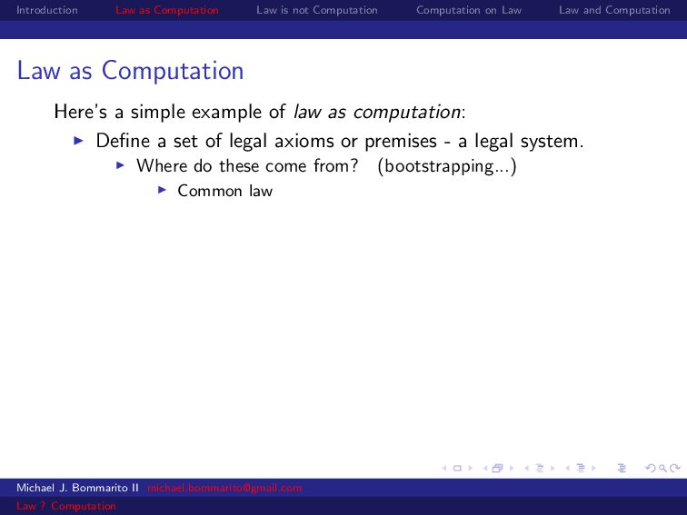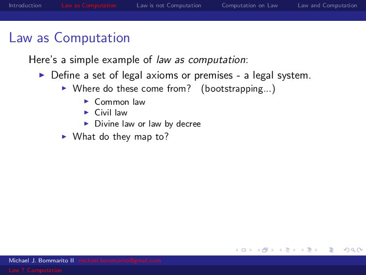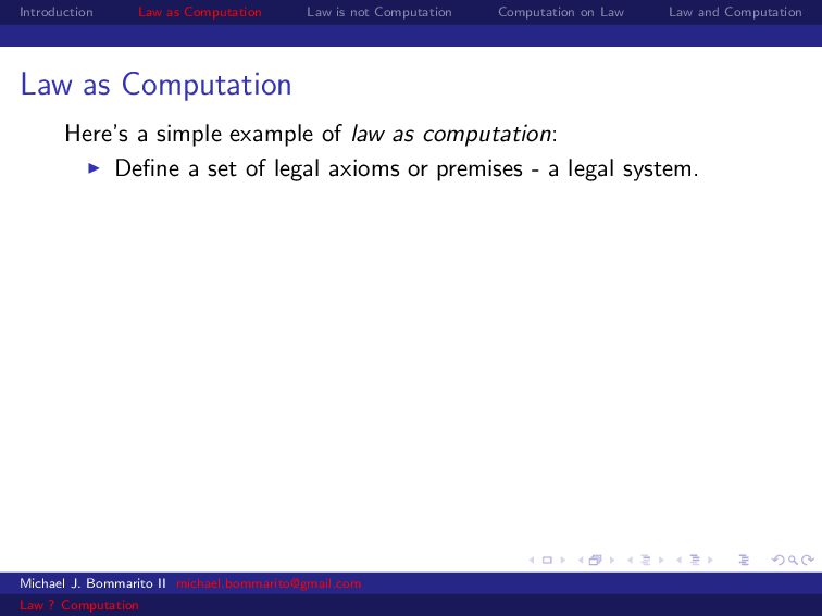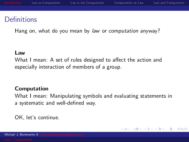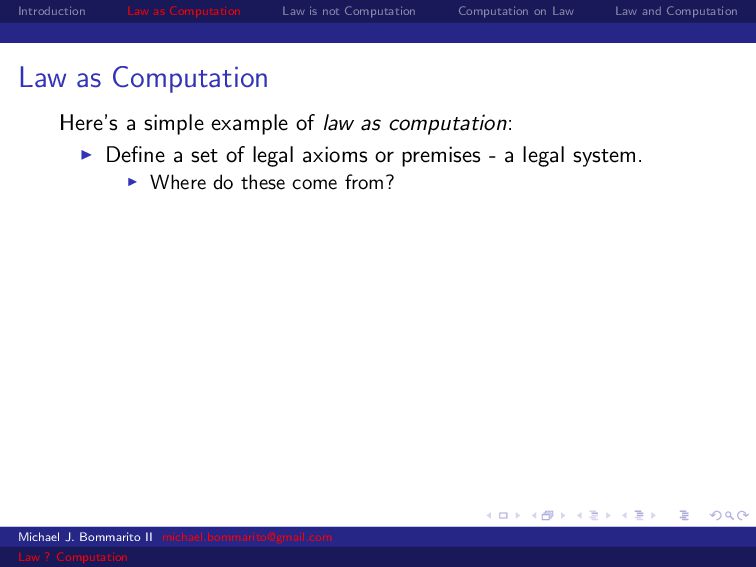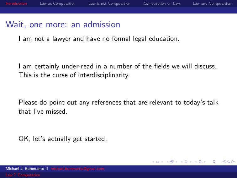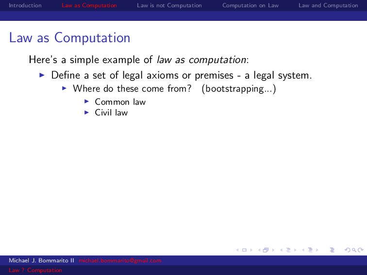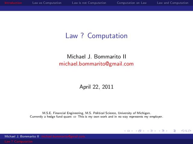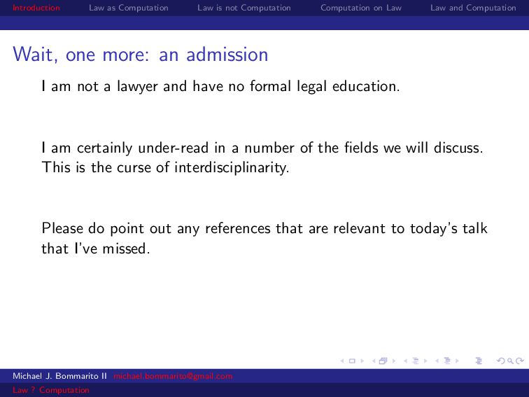 Law Law and Computation Wait, one more: an admission I am not a lawyer and have no formal legal education. I am certainly under-read in a number of the fields we will discuss. This is the curse of interdisciplinarity. Please do point out any references that are relevant to today’s talk that I’ve missed. OK, let’s actually get started. Michael J. Bommarito II [email protected] Law ? Computation