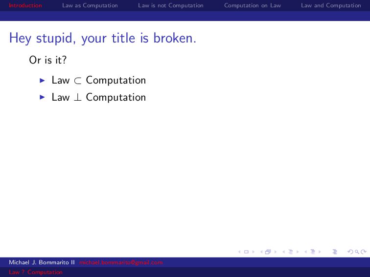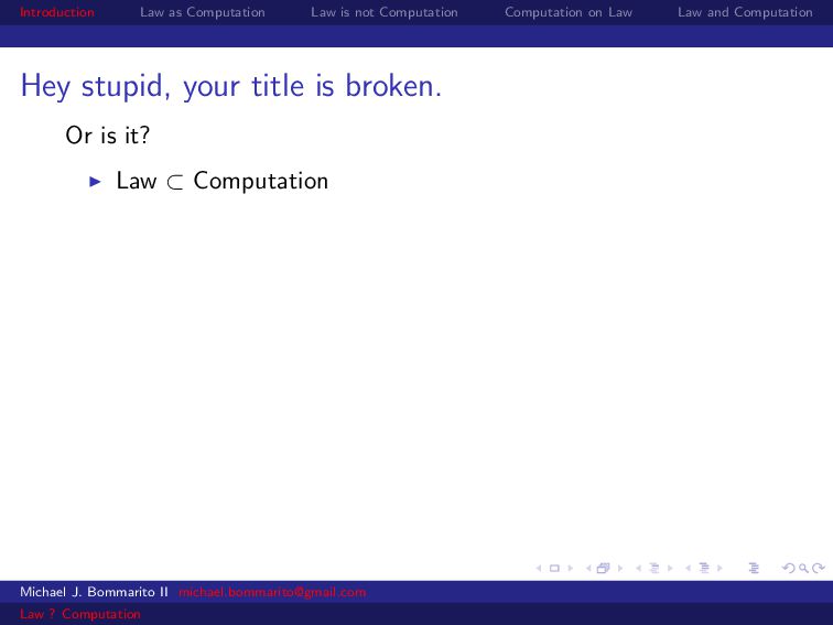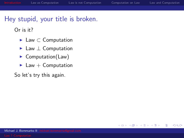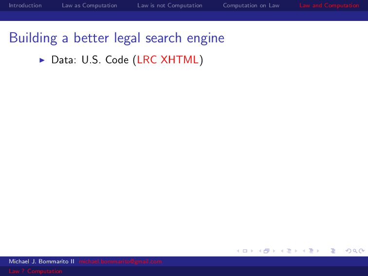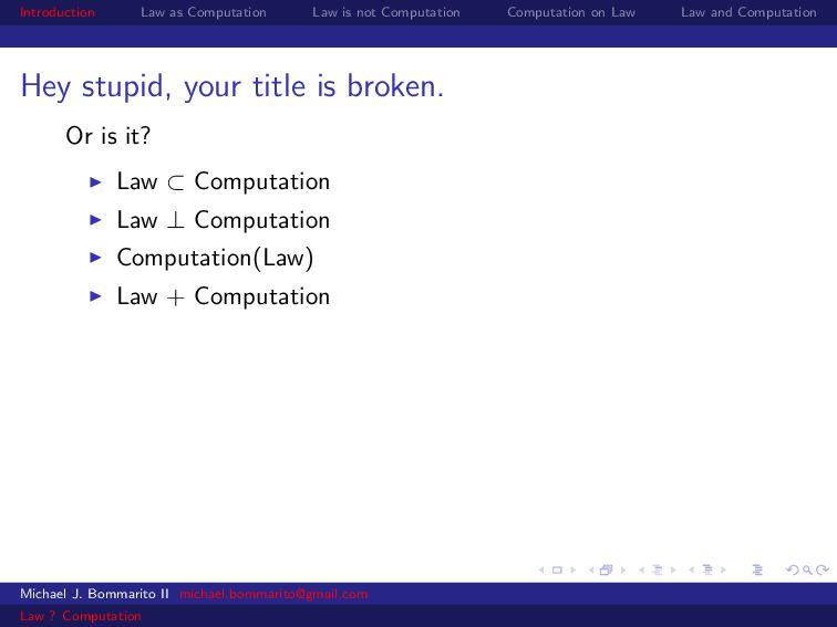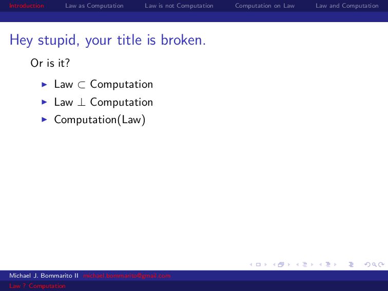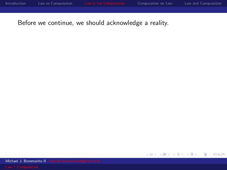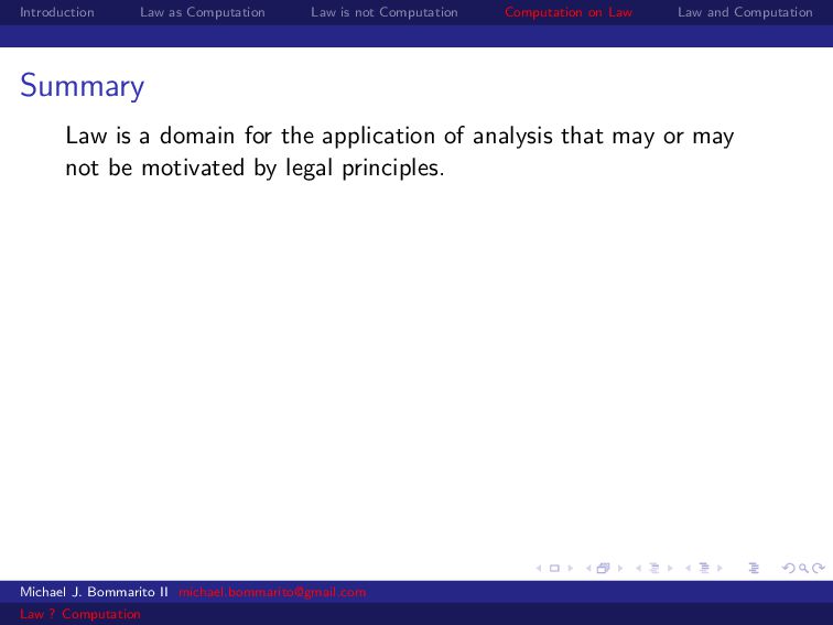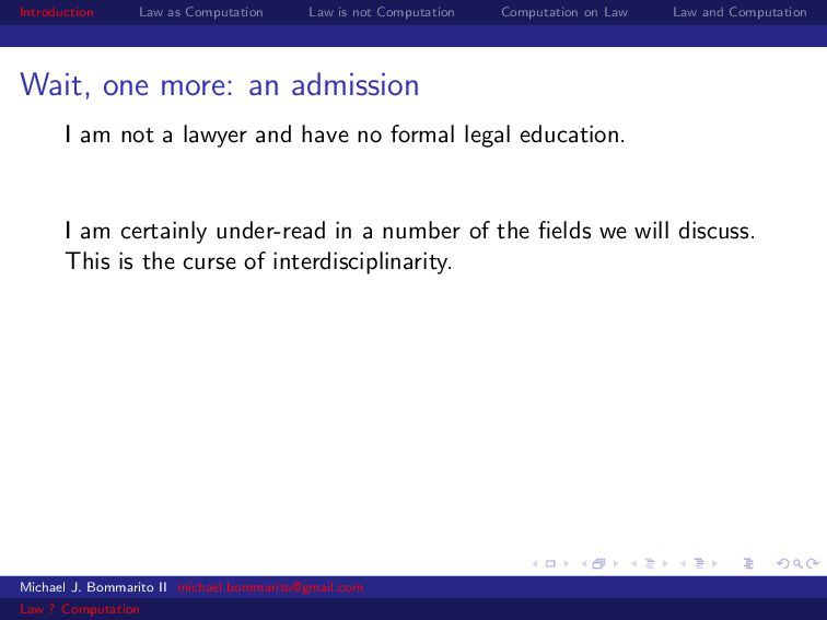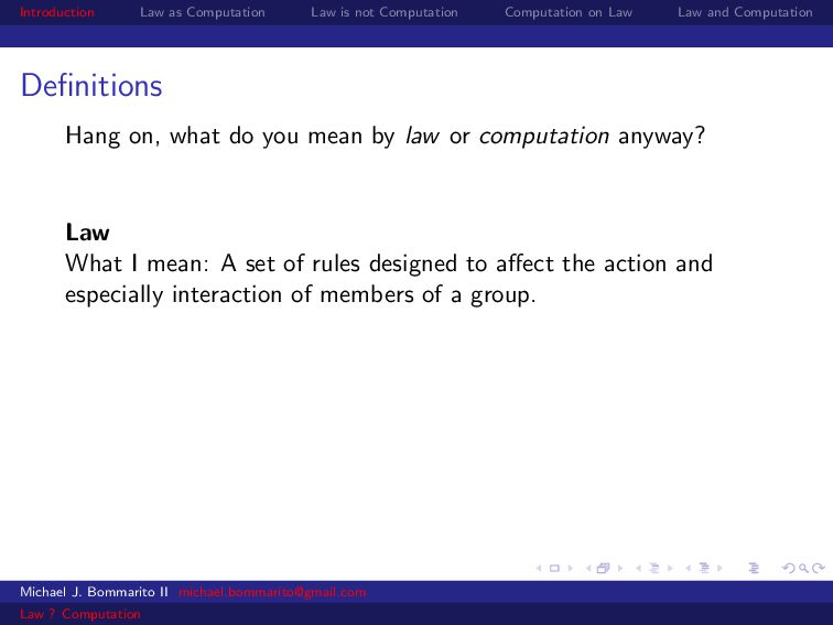 Law Law and Computation Wait, one more: an admission I am not a lawyer and have no formal legal education. I am certainly under-read in a number of the fields we will discuss. This is the curse of interdisciplinarity. Please do point out any references that are relevant to today’s talk that I’ve missed. OK, let’s actually get started. Michael J. Bommarito II [email protected] Law ? Computation