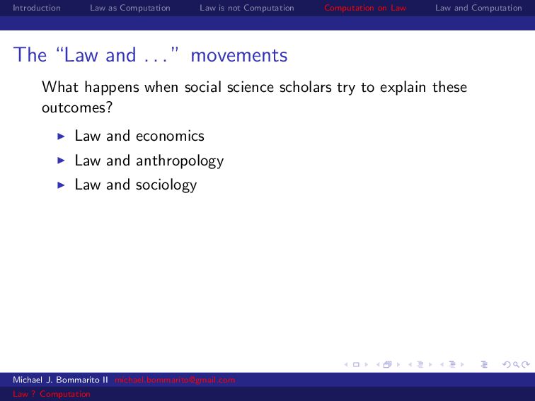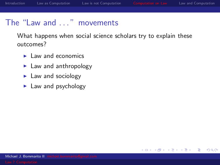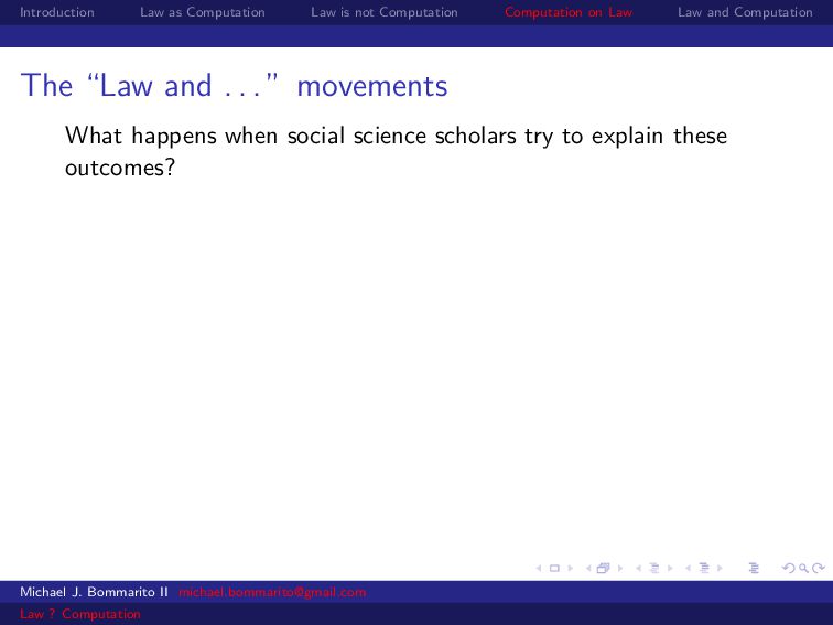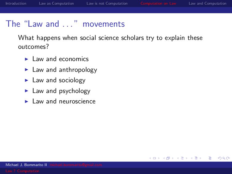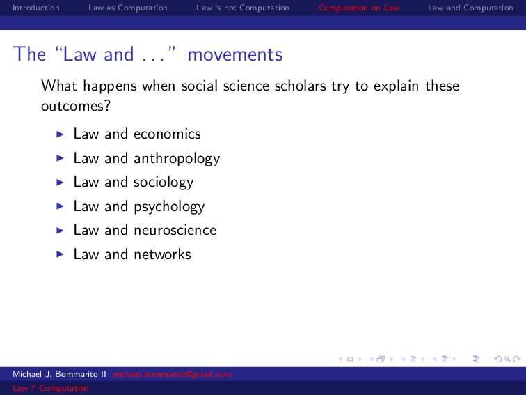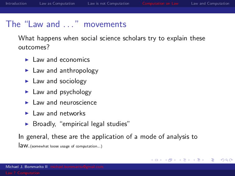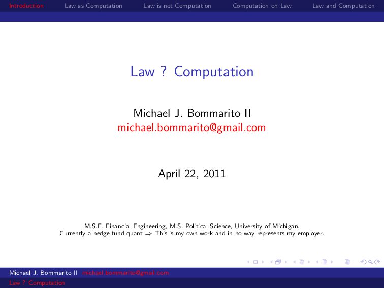 Law Law and Computation Wait, one more: an admission I am not a lawyer and have no formal legal education. I am certainly under-read in a number of the fields we will discuss. This is the curse of interdisciplinarity. Michael J. Bommarito II [email protected] Law ? Computation