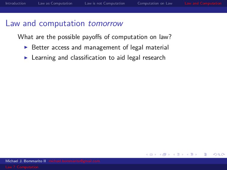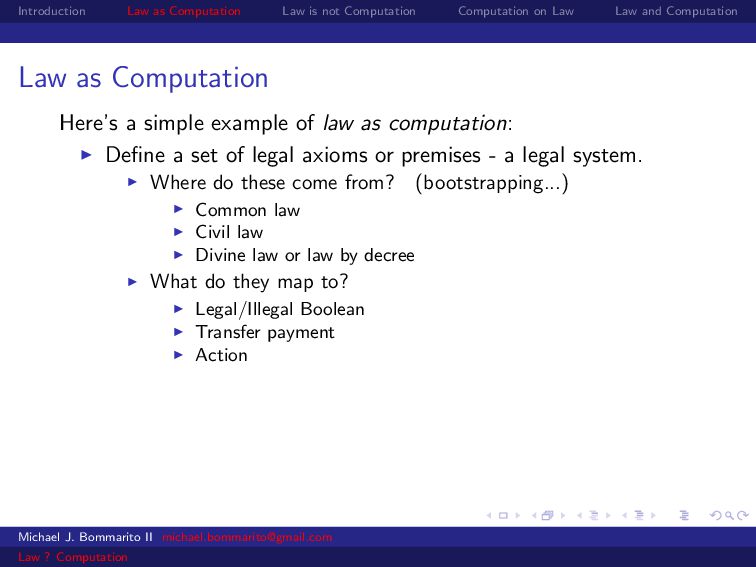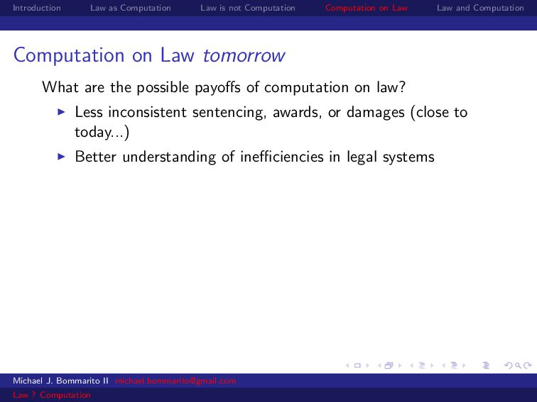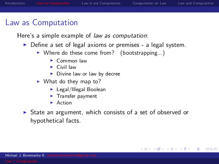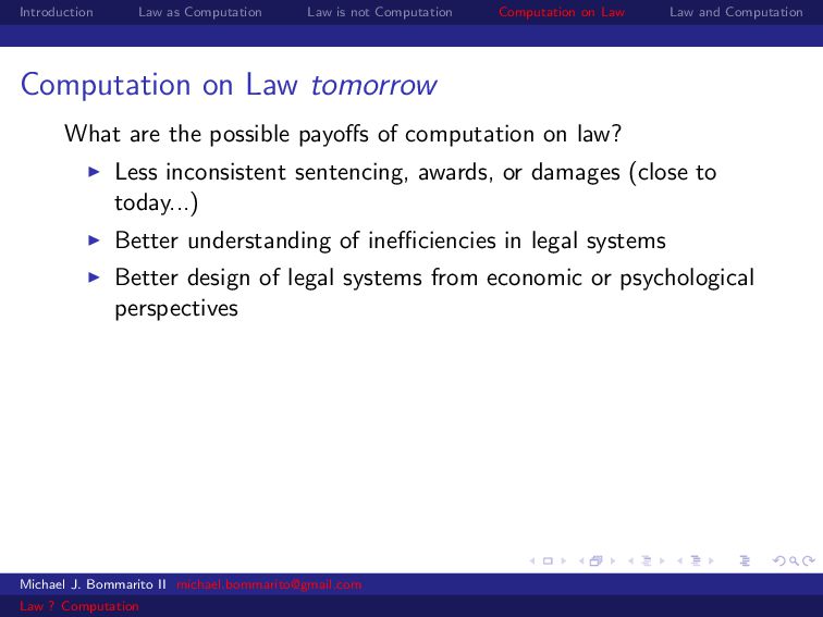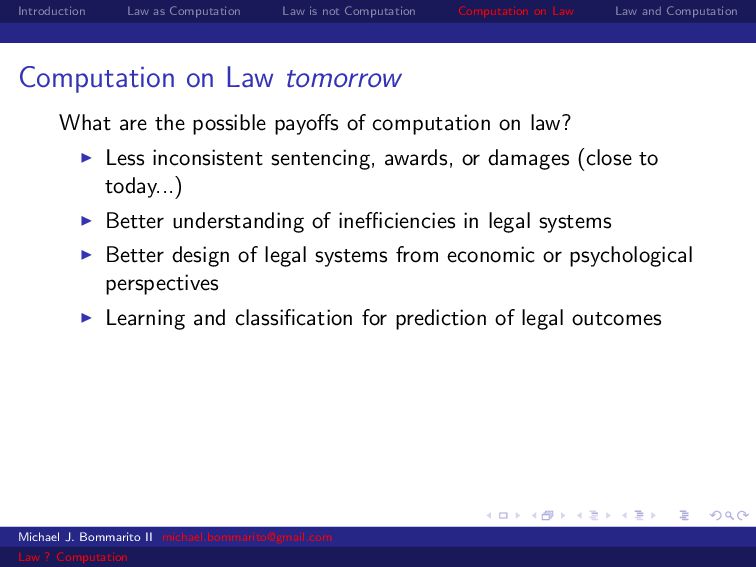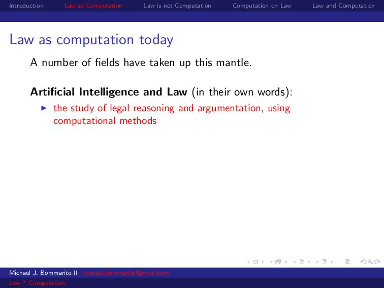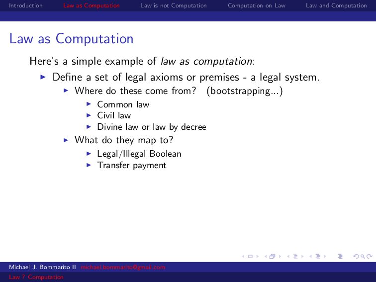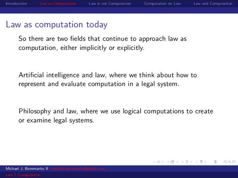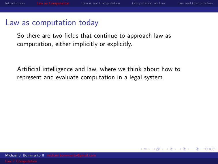 Law Law and Computation Law as computation today So there are two fields that continue to approach law as computation, either implicitly or explicitly. Artificial intelligence and law, where we think about how to represent and evaluate computation in a legal system. Philosophy and law, where we use logical computations to create or examine legal systems. Michael J. Bommarito II [email protected] Law ? Computation