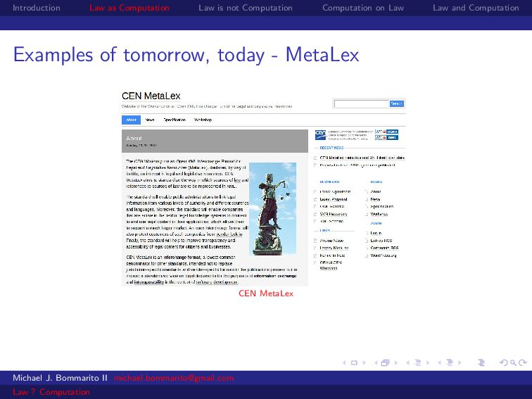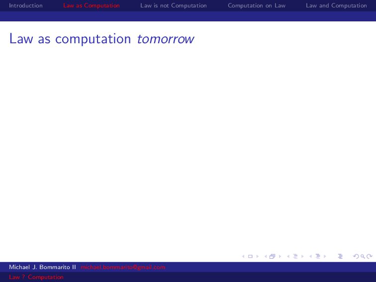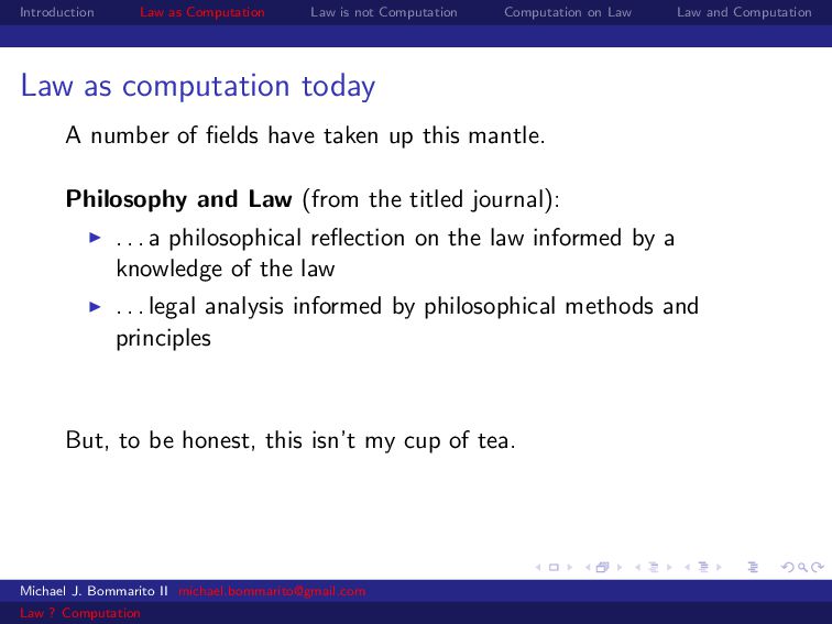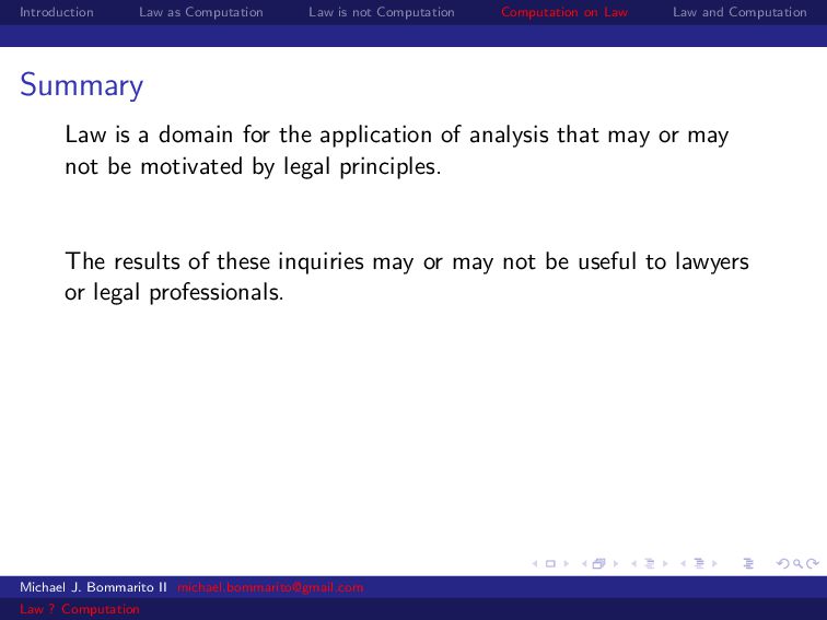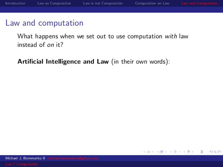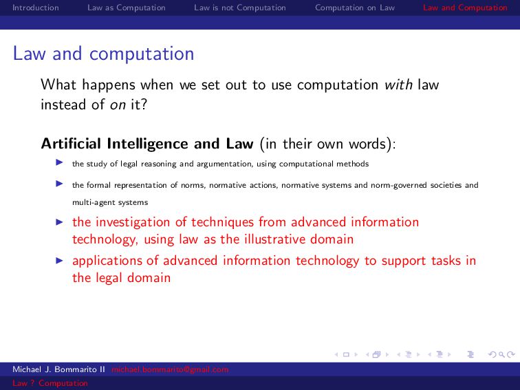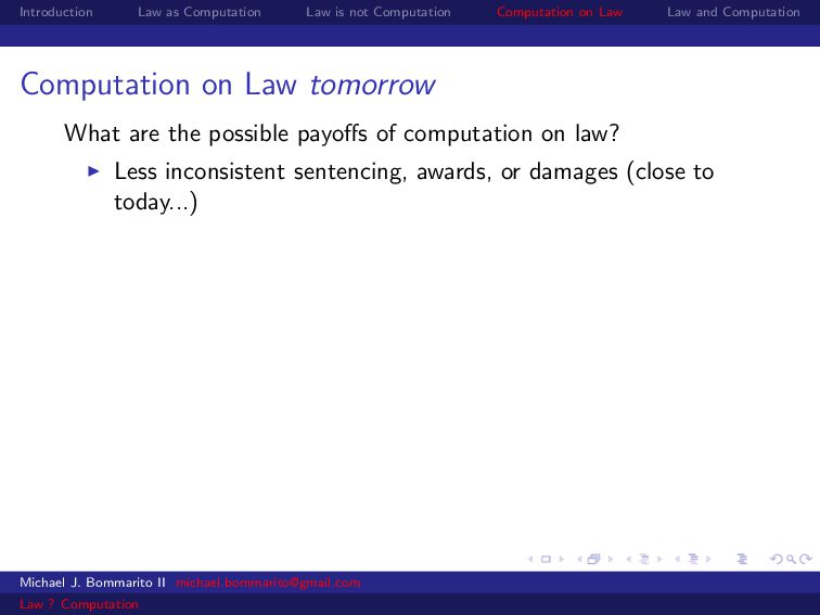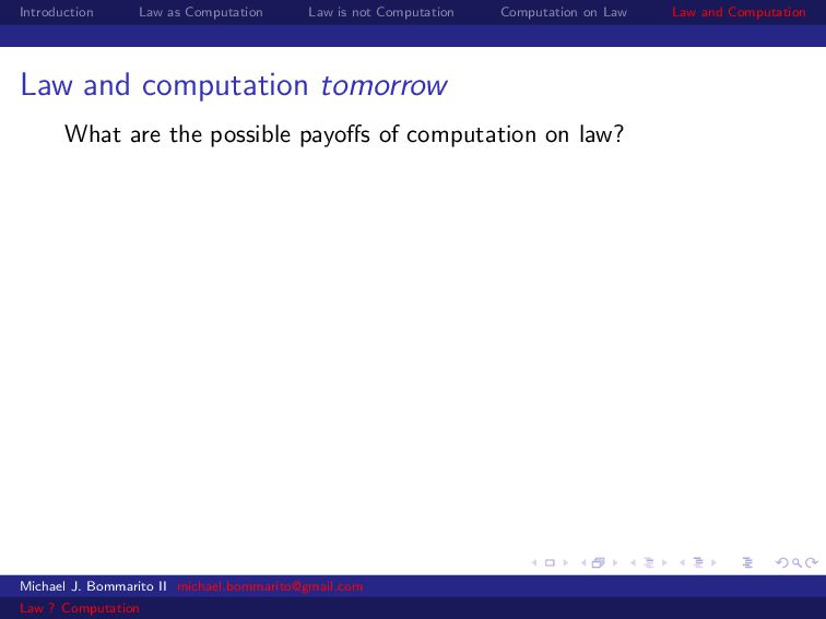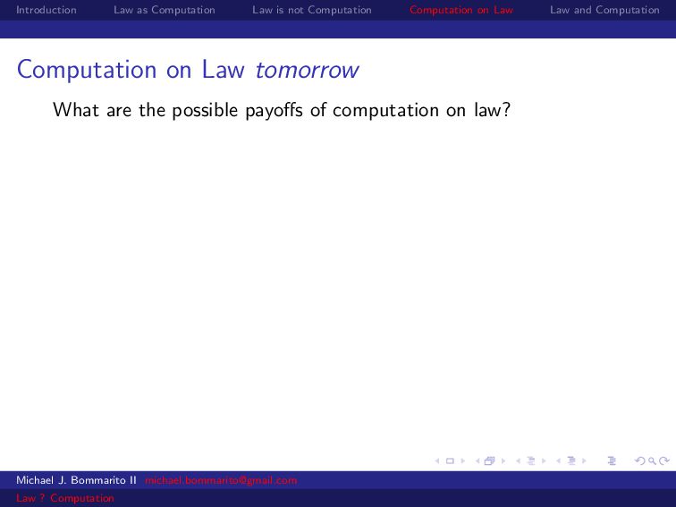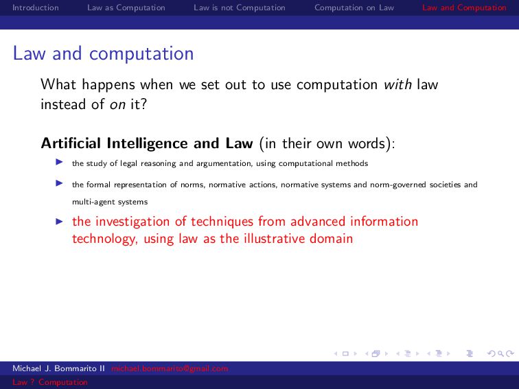 Law Law and Computation Law as computation today So there are two fields that continue to approach law as computation, either implicitly or explicitly. Artificial intelligence and law, where we think about how to represent and evaluate computation in a legal system. Philosophy and law, where we use logical computations to create or examine legal systems. Michael J. Bommarito II [email protected] Law ? Computation