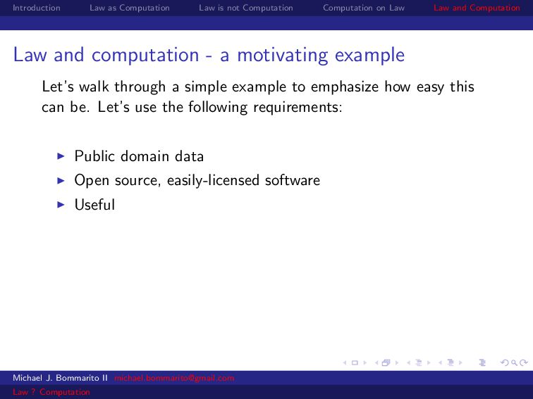Law Law and Computation Law and computation - a motivating example Let’s walk through a simple example to emphasize how easy this can be. Let’s use the following requirements: Michael J. Bommarito II [email protected] Law ? Computation