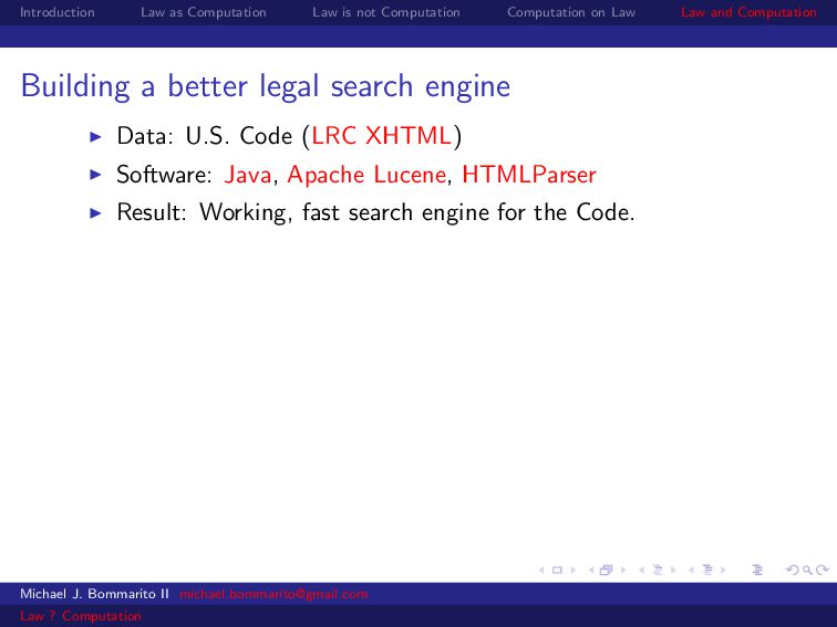 Law Law and Computation Building a better legal search engine Data: U.S. Code (LRC XHTML) Software: Java, Apache Lucene, HTMLParser Result: Working, fast search engine for the Code. $ wc -l src/main/java/org/mjb /* Code* 425 src/main/java/org/mjb/ buildCodeIndex .java 86 src/main/java/org/mjb/ searchCodeIndex .java 511 total Michael J. Bommarito II [email protected] Law ? Computation