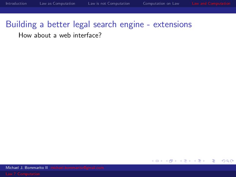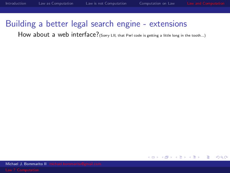 Law Law and Computation Building a better legal search engine - extensions How about a web interface?(Sorry LII, that Perl code is getting a little long in the tooth...) Michael J. Bommarito II [email protected] Law ? Computation