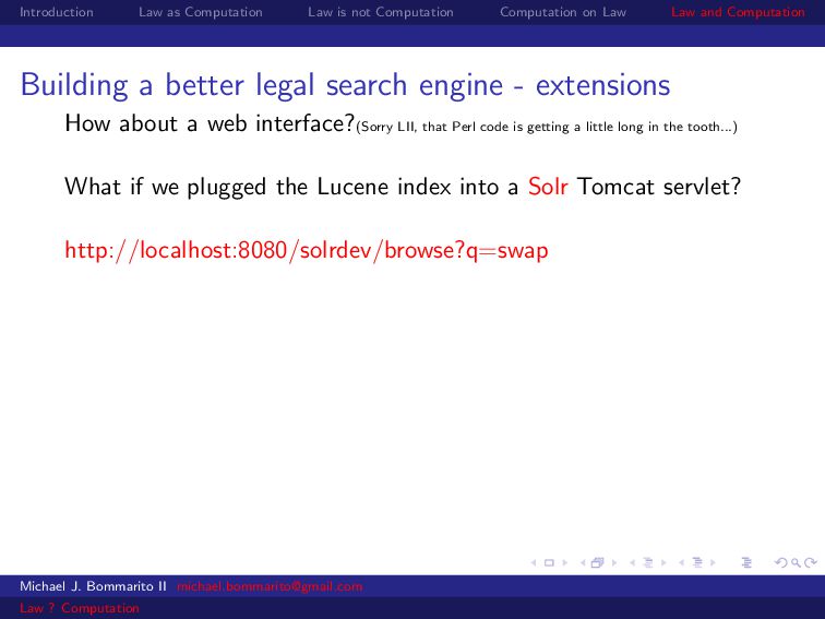 Law Law and Computation Building a better legal search engine - extensions How about a web interface?(Sorry LII, that Perl code is getting a little long in the tooth...) What if we plugged the Lucene index into a Solr Tomcat servlet? http://localhost:8080/solrdev/browse?q=swap Michael J. Bommarito II [email protected] Law ? Computation