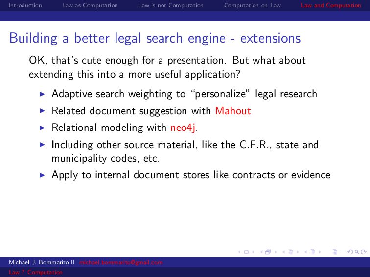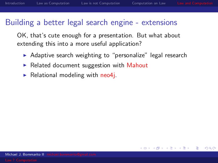 Law Law and Computation Building a better legal search engine - extensions OK, that’s cute enough for a presentation. But what about extending this into a more useful application? Adaptive search weighting to “personalize” legal research Related document suggestion with Mahout Relational modeling with neo4j. Including other source material, like the C.F.R., state and municipality codes, etc. Michael J. Bommarito II [email protected] Law ? Computation