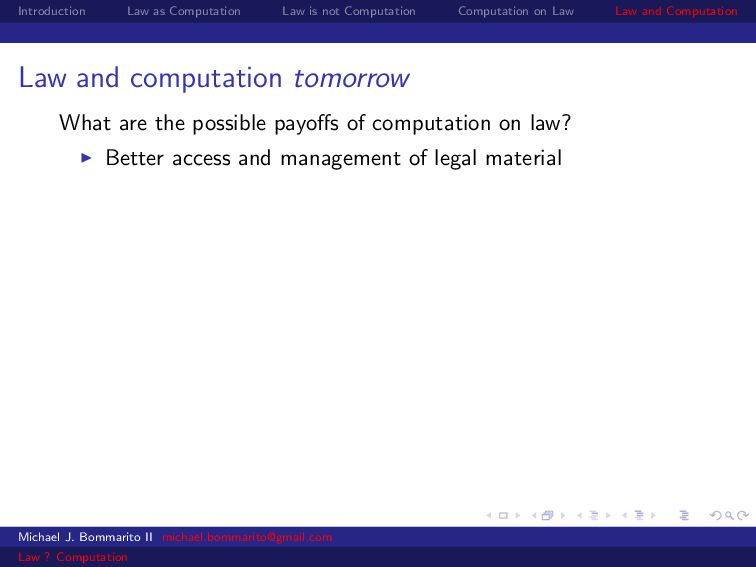 Law Law and Computation Law and computation tomorrow What are the possible payoffs of computation on law? Better access and management of legal material Michael J. Bommarito II [email protected] Law ? Computation