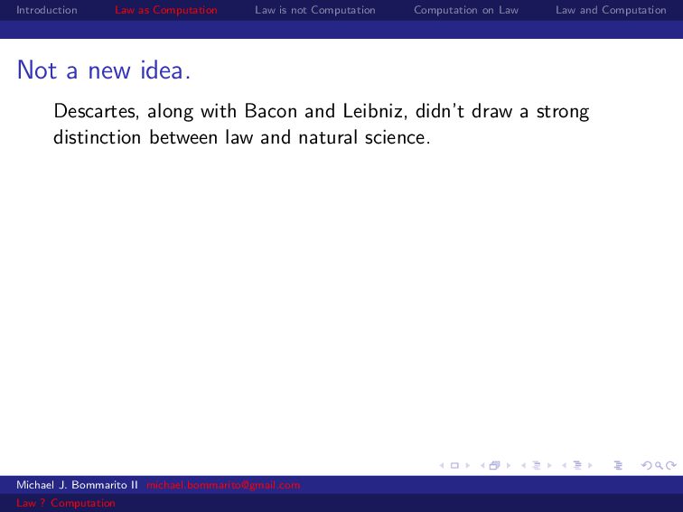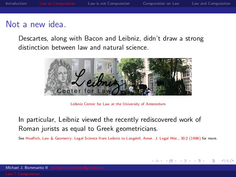 Law Law and Computation Not a new idea. Descartes, along with Bacon and Leibniz, didn’t draw a strong distinction between law and natural science. Leibniz Center for Law at the University of Amsterdam In particular, Leibniz viewed the recently rediscovered work of Roman jurists as equal to Greek geometricians. See Hoeflich, Law & Geometry: Legal Science from Leibniz to Langdell, Amer. J. Legal Hist., 30:2 (1986) for more. Michael J. Bommarito II [email protected] Law ? Computation