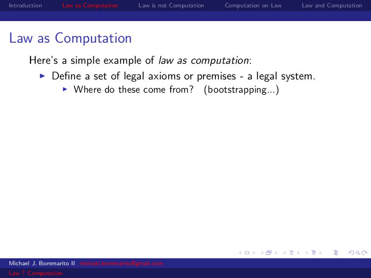 Law Law and Computation Law as Computation Here’s a simple example of law as computation: Define a set of legal axioms or premises - a legal system. Where do these come from? (bootstrapping...) Michael J. Bommarito II [email protected] Law ? Computation