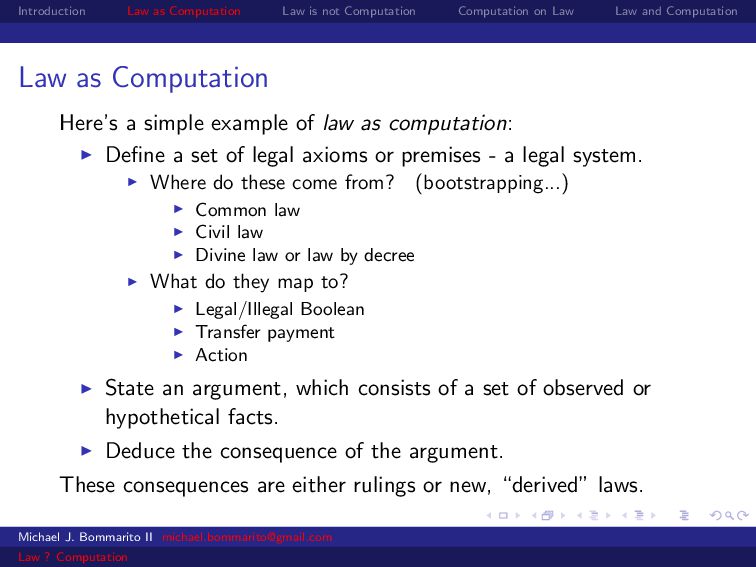 Law Law and Computation Law as Computation Here’s a simple example of law as computation: Define a set of legal axioms or premises - a legal system. Michael J. Bommarito II [email protected] Law ? Computation