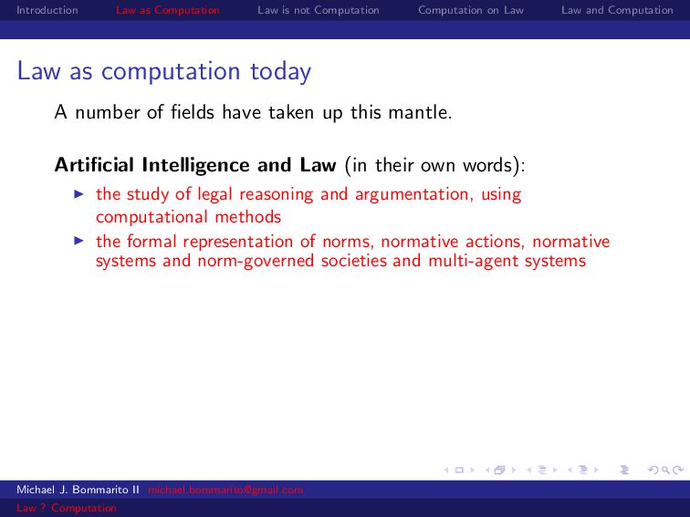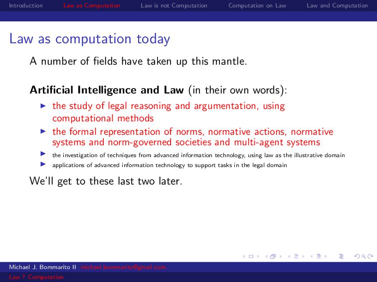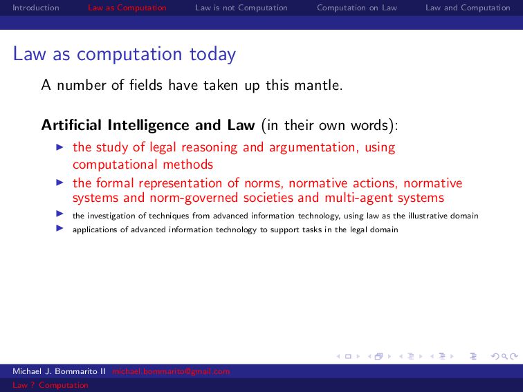 Law Law and Computation Law as computation today So there are two fields that continue to approach law as computation, either implicitly or explicitly. Artificial intelligence and law, where we think about how to represent and evaluate computation in a legal system. Michael J. Bommarito II [email protected] Law ? Computation
