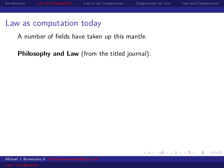 Law Law and Computation Law as computation today A number of fields have taken up this mantle. Philosophy and Law (from the titled journal): Michael J. Bommarito II [email protected] Law ? Computation
