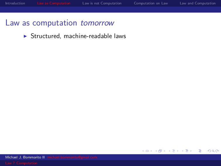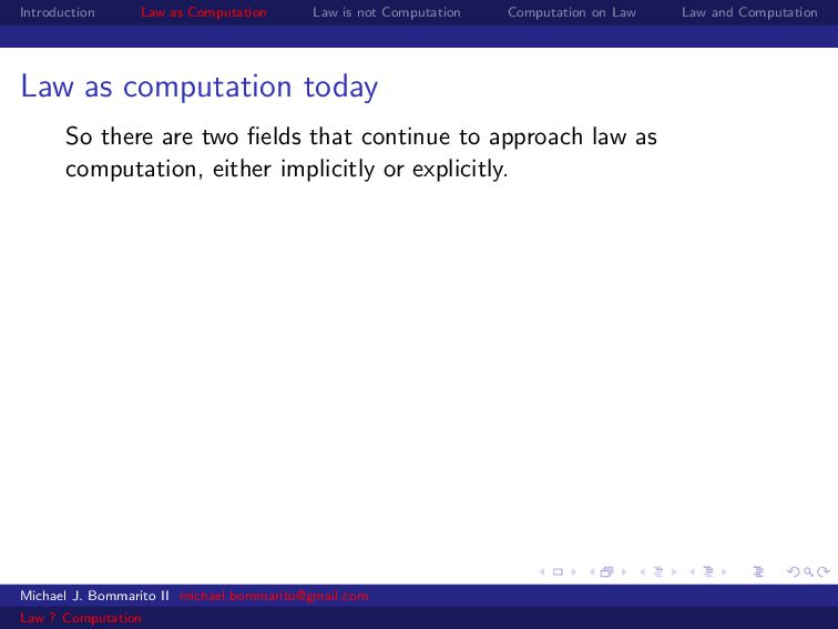 Law Law and Computation Law as computation today So there are two fields that continue to approach law as computation, either implicitly or explicitly. Michael J. Bommarito II [email protected] Law ? Computation