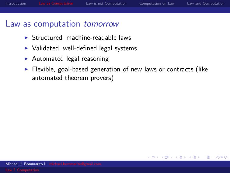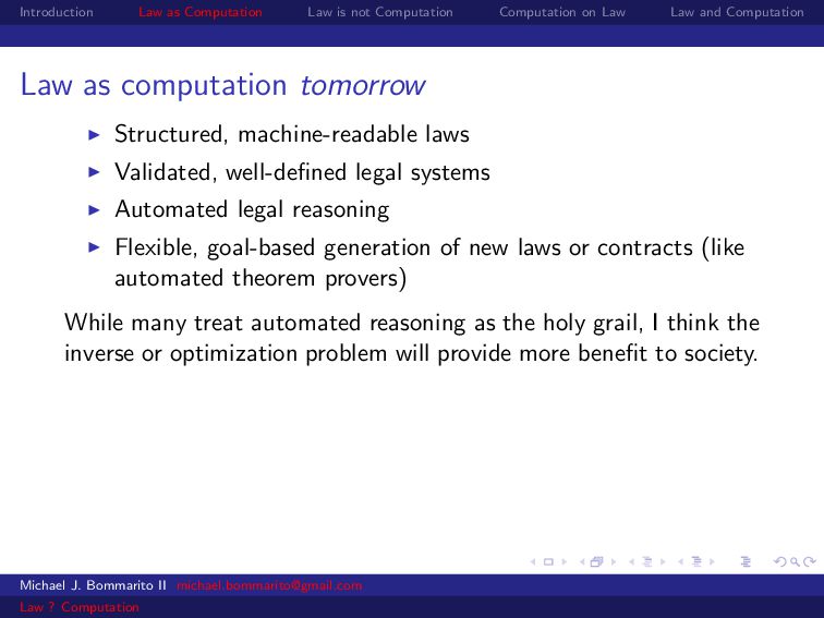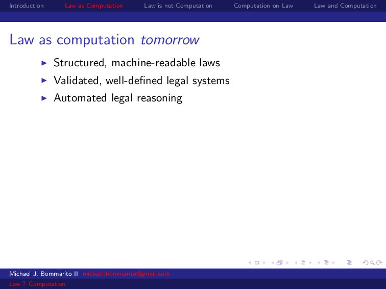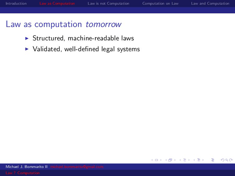 Law Law and Computation Law as computation tomorrow Structured, machine-readable laws Validated, well-defined legal systems Automated legal reasoning Flexible, goal-based generation of new laws or contracts (like automated theorem provers) Michael J. Bommarito II [email protected] Law ? Computation