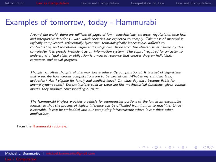 Law Law and Computation Examples of tomorrow, today - Hammurabi Around the world, there are millions of pages of law - constitutions, statutes, regulations, case law, and interpretive decisions - with which societies are expected to comply. This mass of material is logically complicated, referentially byzantine, terminologically inaccessible, difficult to contextualize, and sometimes vague and ambiguous. Aside from the ethical issues caused by this complexity, it is grossly inefficient as an information system. The capital required for an actor to understand a legal right or obligation is a wasted resource that creates drag on individual, corporate, and social progress. Though not often thought of this way, law is inherently computational. It is a set of algorithms that prescribe how various computations are to be carried out. What is my standard (tax) deduction? Am I eligible for family and medical leave? On what day did I become liable for unemployment taxes? Determinations such as these are like mathematical functions: given various inputs, they produce corresponding outputs. The Hammurabi Project provides a vehicle for representing portions of the law in an executable format, so that the process of logical inference can be offloaded from human to machine. Once executable, it can be embedded into our computing infrastructure where it can drive other applications. From the Hammurabi rationale. Michael J. Bommarito II [email protected] Law ? Computation