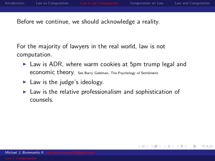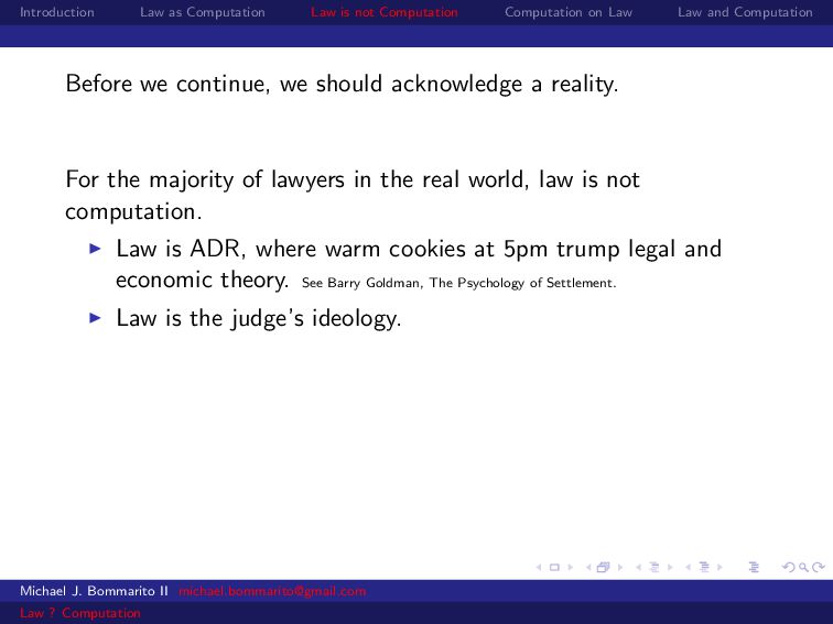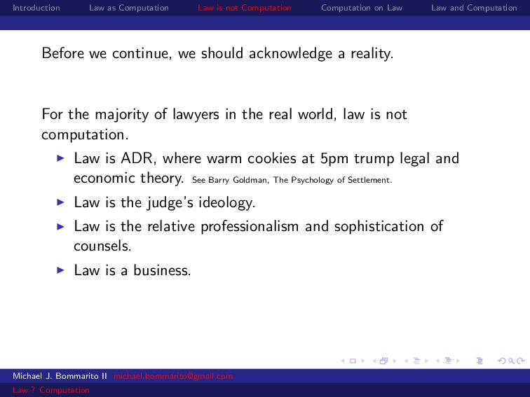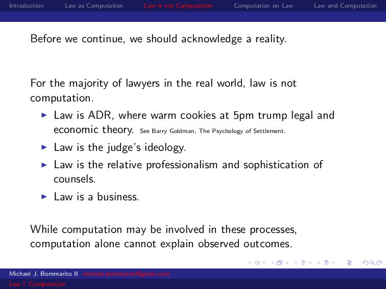 Law Law and Computation Before we continue, we should acknowledge a reality. For the majority of lawyers in the real world, law is not computation. Law is ADR, where warm cookies at 5pm trump legal and economic theory. See Barry Goldman, The Psychology of Settlement. Michael J. Bommarito II [email protected] Law ? Computation