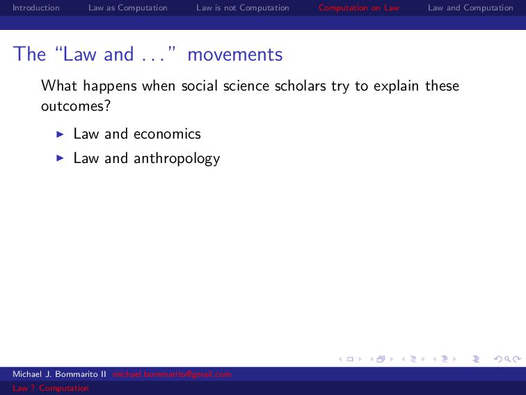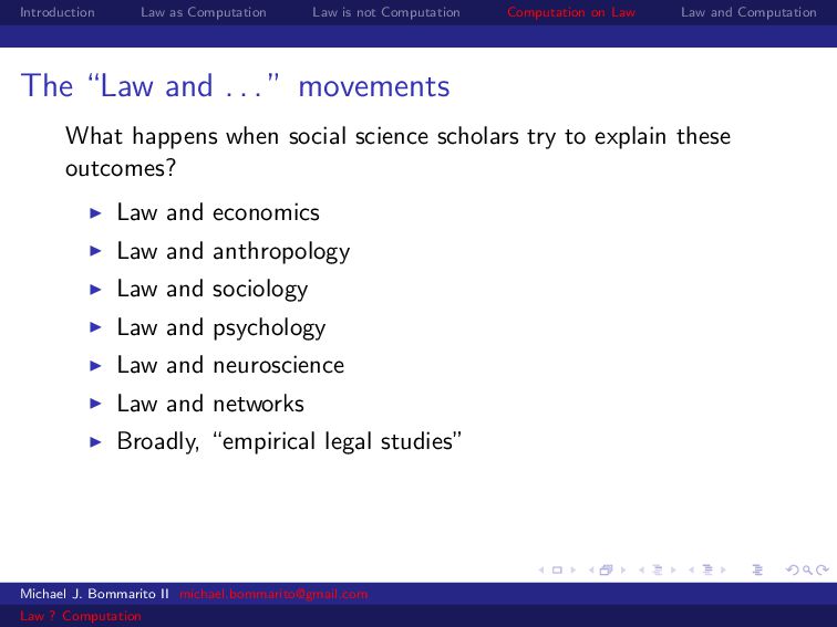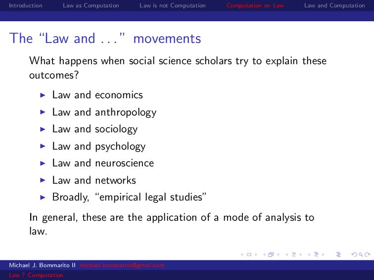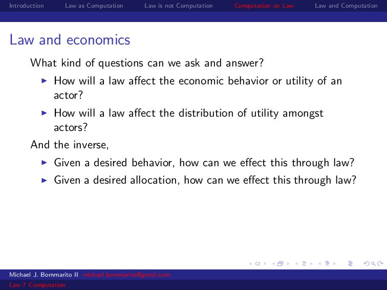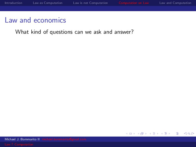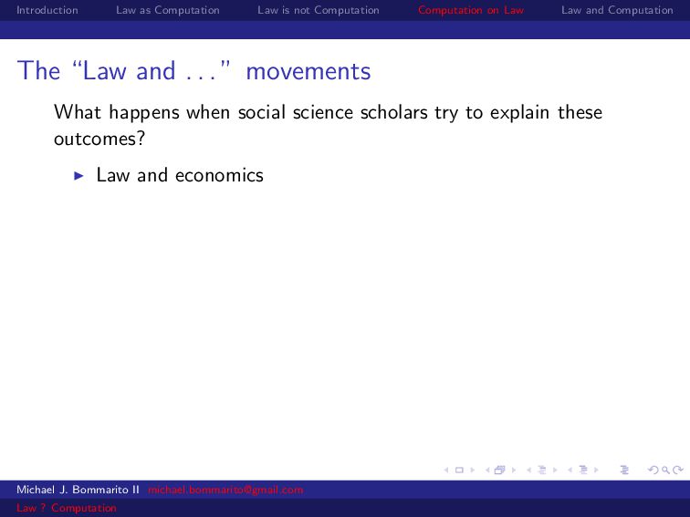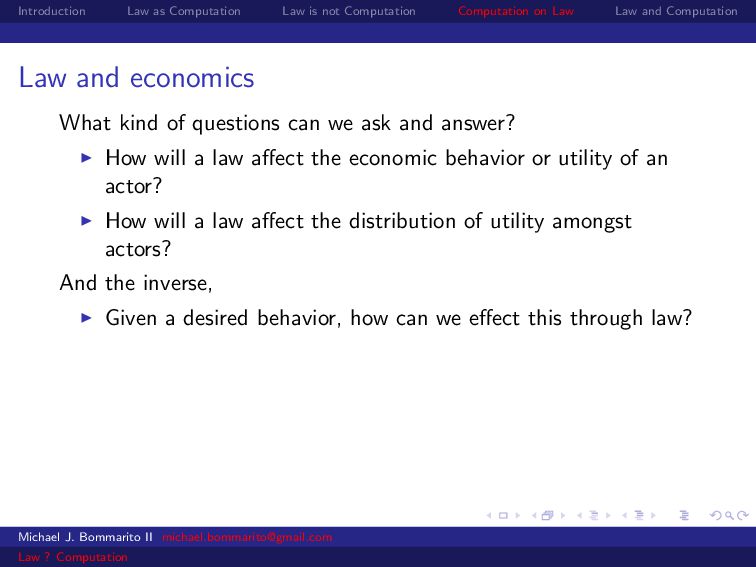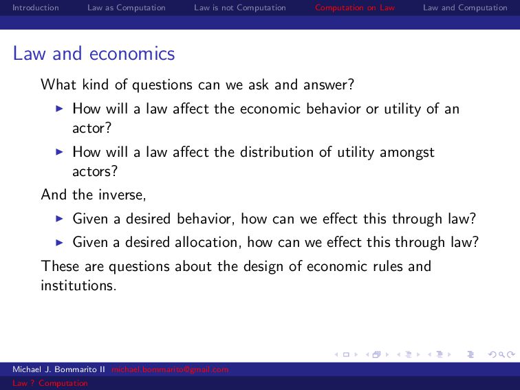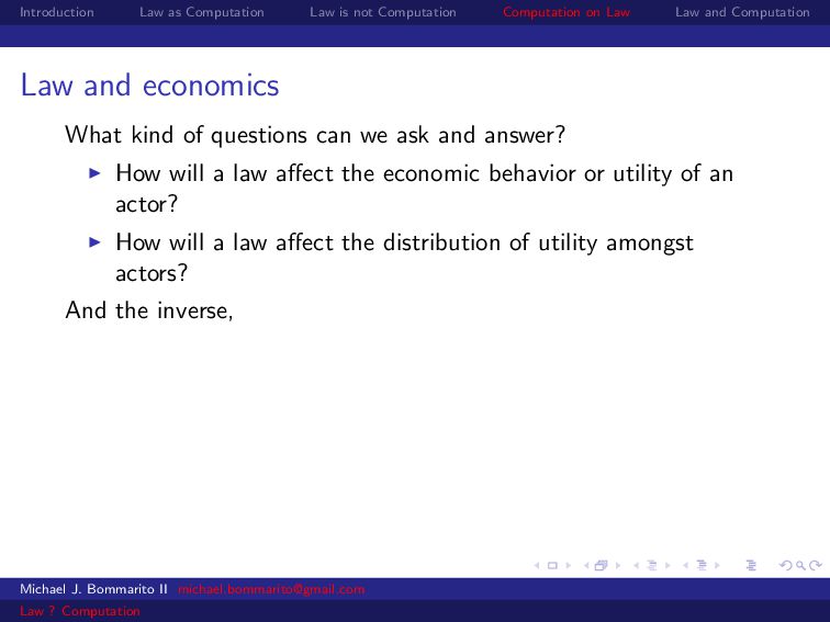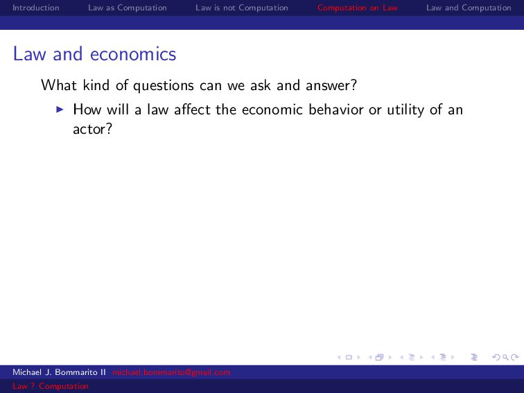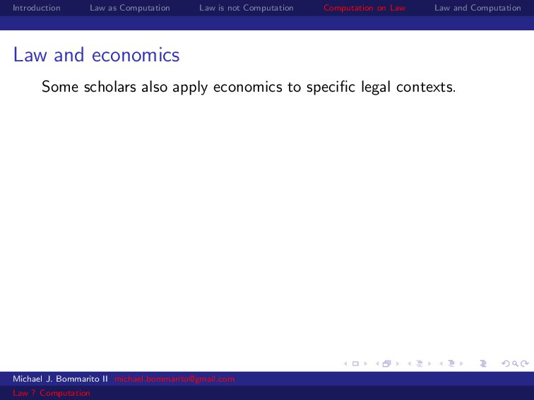 Law Law and Computation Law and economics Some scholars also apply economics to specific legal contexts. For example, why would a legal dispute go through a lengthy, expensive trial instead of a relatively cheap settlement? Michael J. Bommarito II [email protected] Law ? Computation