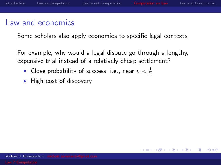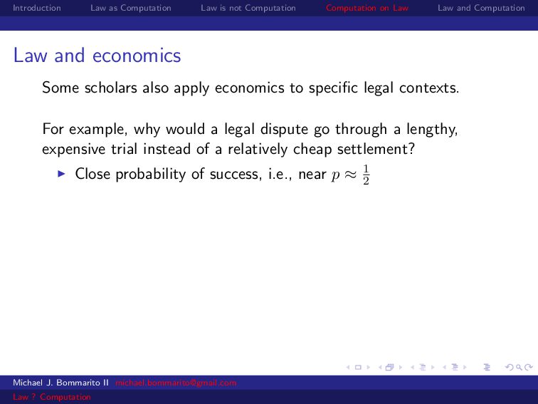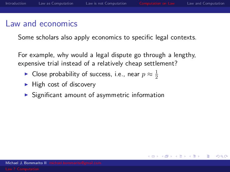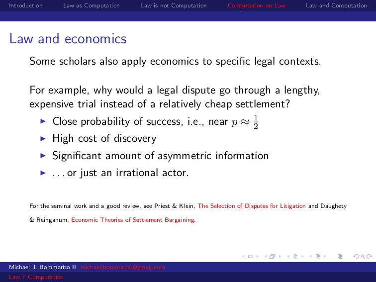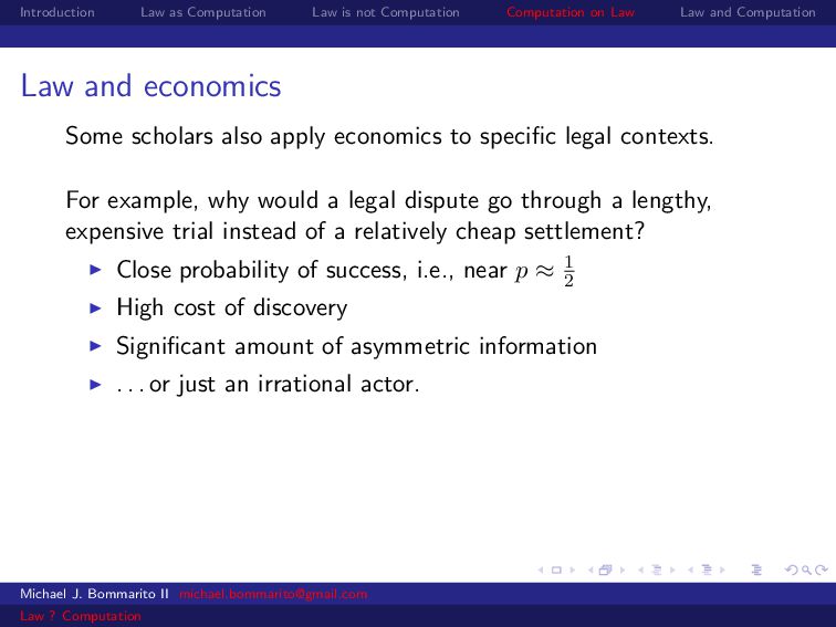 Law Law and Computation Law and economics Some scholars also apply economics to specific legal contexts. For example, why would a legal dispute go through a lengthy, expensive trial instead of a relatively cheap settlement? Close probability of success, i.e., near p ≈ 1 2 Michael J. Bommarito II [email protected] Law ? Computation