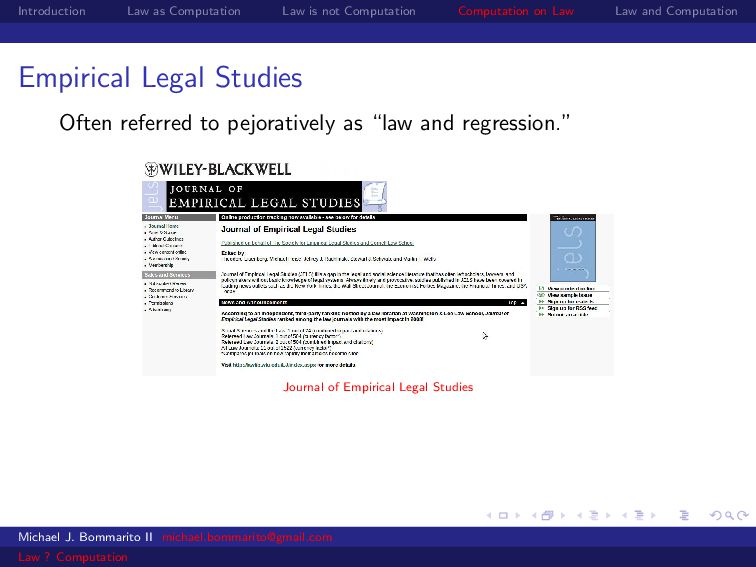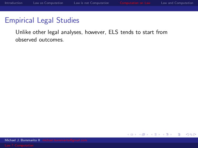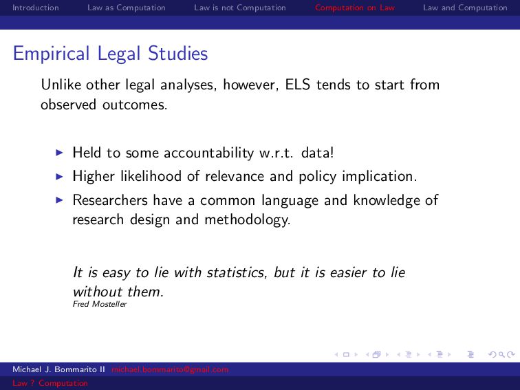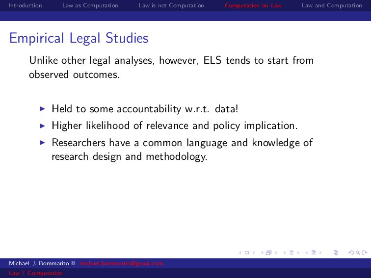 Law Law and Computation Empirical Legal Studies Unlike other legal analyses, however, ELS tends to start from observed outcomes. Held to some accountability w.r.t. data! Higher likelihood of relevance and policy implication. Researchers have a common language and knowledge of research design and methodology. Michael J. Bommarito II [email protected] Law ? Computation