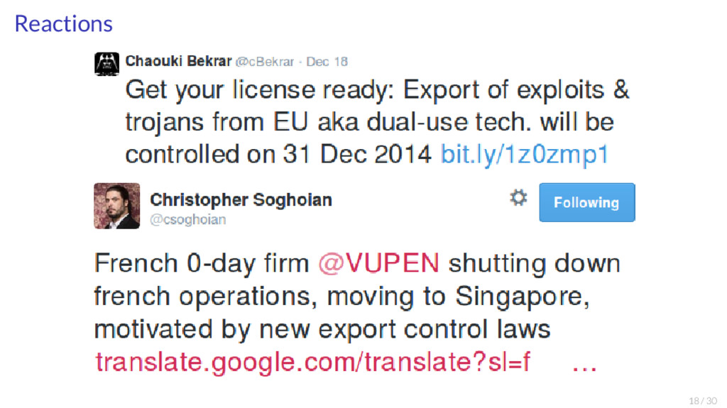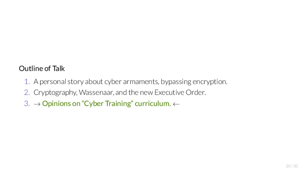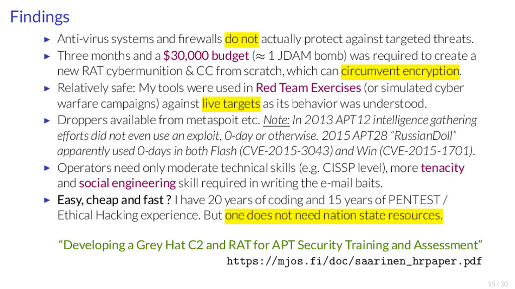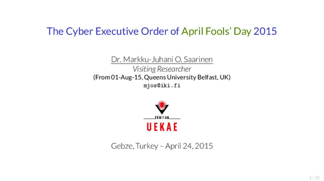 Office of the Press Secretary For Immediate Release April 1, 2015 TEXT OF A LETTER FROM THE PRESIDENT TO THE SPEAKER OF THE HOUSE OF REPRESENTATIVES AND THE PRESIDENT OF THE SENATE April 1, 2015 Dear Mr. Speaker: (Dear Mr. President:) Pursuant to the International Emergency Economic Powers Act (50 U.S.C. 1701 et seq.) (IEEPA), I hereby report that I have issued an Executive Order (the "order") declaring a national emergency with respect to the unusual and extraordinary threat to the national security, foreign policy, and economy of the United States posed by the increasing prevalence and severity of malicious cyber-enabled activities originating from, or directed by persons located, in whole or in substantial part, outside the United States. The order would block the property and interests in property of: any person determined by the Secretary of the Treasury, in consultation with the Attorney General and the Secretary of State, to be responsible for or complicit in, or to have engaged in, directly or indirectly, cyber-enabled activities originating from, or directed by persons located, in whole or in substantial part, outside the United States that are reasonably likely to result in, or have materially contributed to, a significant threat to the national security, foreign policy, or economic health or financial stability of the United States and that have the purpose or effect of: o harming, or otherwise significantly compromising the provision of services by, a computer or network of computers that support one or more entities in a critical infrastructure sector; o significantly compromising the provision of services by one or more entities in a critical infrastructure sector; o causing a significant disruption to the availability of a computer or network of computers; or o causing a significant misappropriation of funds or economic resources, trade secrets, personal identifiers, or financial information for commercial or competitive advantage or private financial gain; or http://www.whitehouse.gov “I, BARACK OBAMA, President of the United States of America, find that the increasing prevalence and severity of malicious cyber-enabled activities originating from, or directed by persons located, in whole or in substantial part, outside the United States constitute an unusual and extraordinary threat to the national security, foreign policy, and economy of the United States. I hereby declare a national emergency to deal with this threat.” “(B) to have materially assisted, sponsored, or provided financial, material, or technological support for, or goods or services in support of, any activity described in subsections (a)(i) or (a)(ii)(A) of this section or any person whose property and interests in property are blocked pursuant to this order;” Ergo: I quit this line of work, moved fully to Academia! 19 / 30