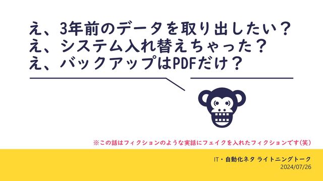 え、3年前のデータを取り出したい? え、システム入れ替えちゃった? え、バックアップはPDFだけ? IT・自動化ネタ ライトニングトーク 2024/07/26 ※この話はフィクションのような実話にフェイクを入れたフィクションです(笑)