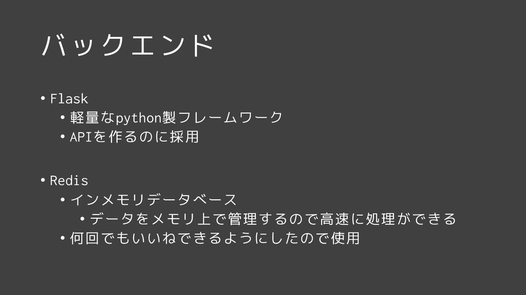 バックエンド • Flask • 軽量なpython製フレームワーク • APIを作るのに採用 • Redis •