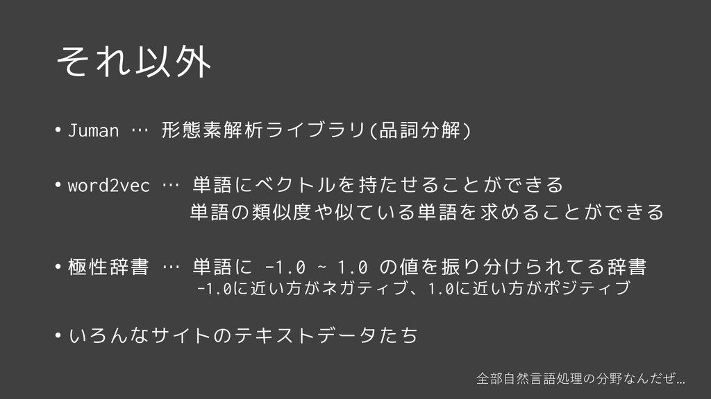 それ以外 • Juman … 形態素解析ライブラリ(品詞分解) • word2vec … 単語にベクトルを持たせることができる 単語の類似度や似ている単語を求めることができる
