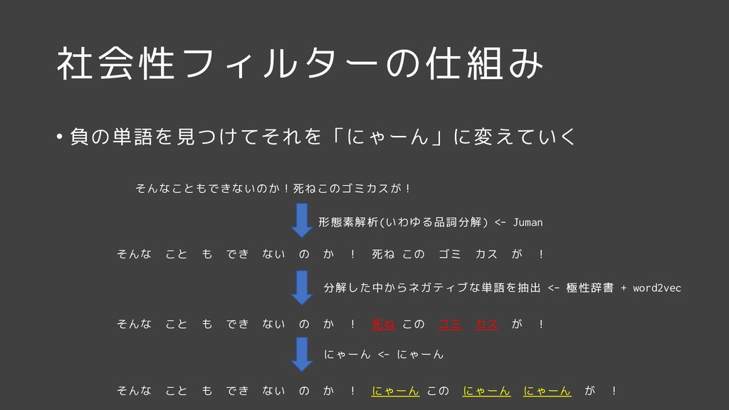 か ! 死ね この ゴミ カス が ! そんな こと も でき ない の か ! 死ね この ゴミ カス が ! 形態素解析(いわゆる品詞分解) <- Juman 分解した中からネガティブな単語を抽出 <- 極性辞書 + word2vec そんな こと も でき ない の か ! にゃーん この にゃーん にゃーん が ! にゃーん <- にゃーん