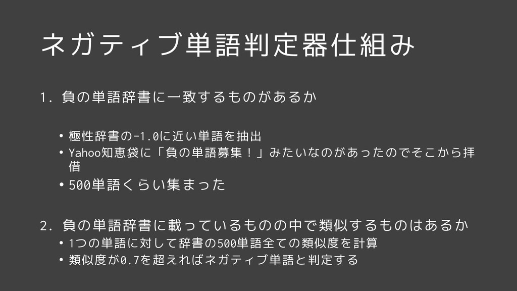 ネガティブ単語判定器仕組み 1. 負の単語辞書に一致するものがあるか • 極性辞書の-1.0に近い単語を抽出 • Yahoo知恵袋に「負の単語募集!」みたいなのがあったのでそこから拝 借 • 500単語くらい集まった