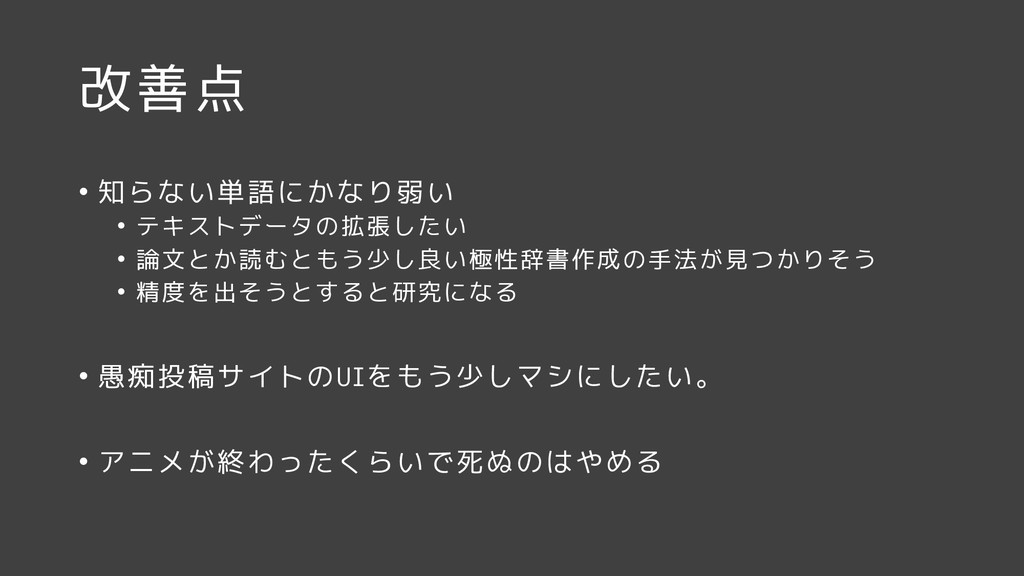 改善点 • 知らない単語にかなり弱い • テキストデータの拡張したい • 論文とか読むともう少し良い極性辞書作成の手法が見つかりそう • 精度を出そうとすると研究になる •