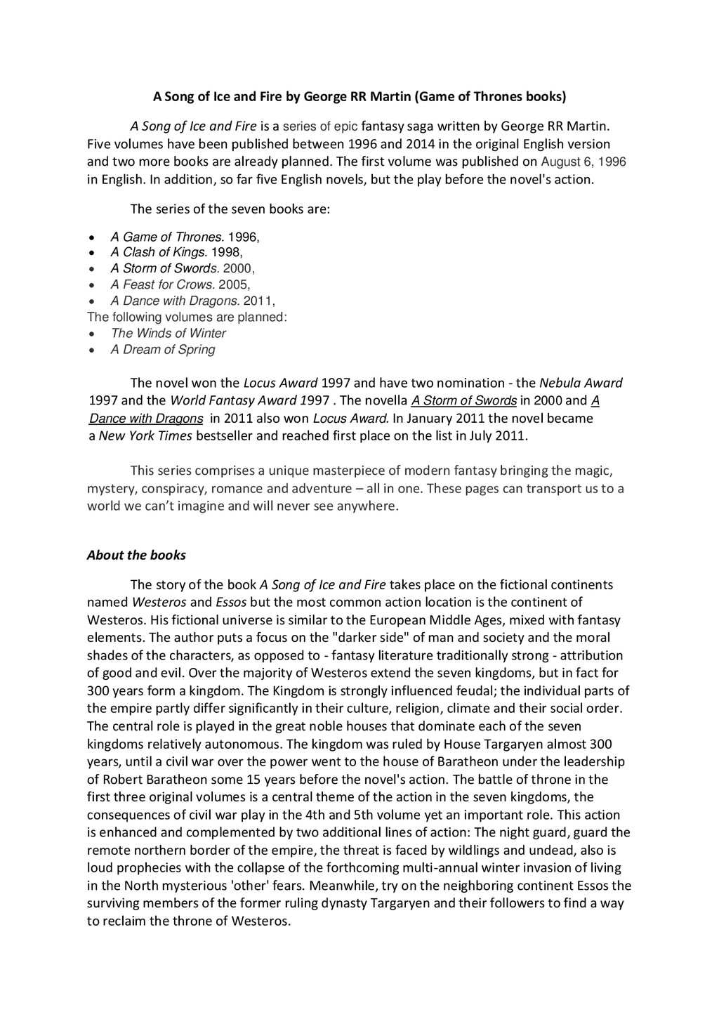 The hit television series Game of Thrones was derived from a series of novels by George R.R. Martin, who has created a world of high fantasy and excitement that remains unrivaled in the world of both reading and television. The series of novels, entitled collectively A Song of Ice and Fire, was originally planned to extend to three volumes, yet the success of the series, and the sheer breadth of the cast of characters involved, has seen the author extend the series to a planned seven volumes, five of which have so far been published to great acclaim.