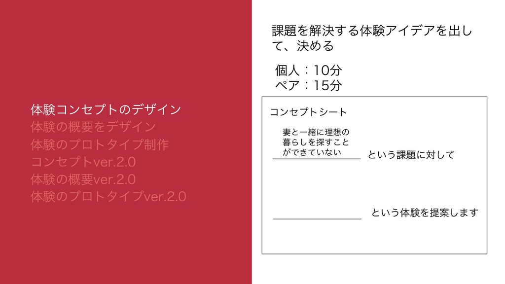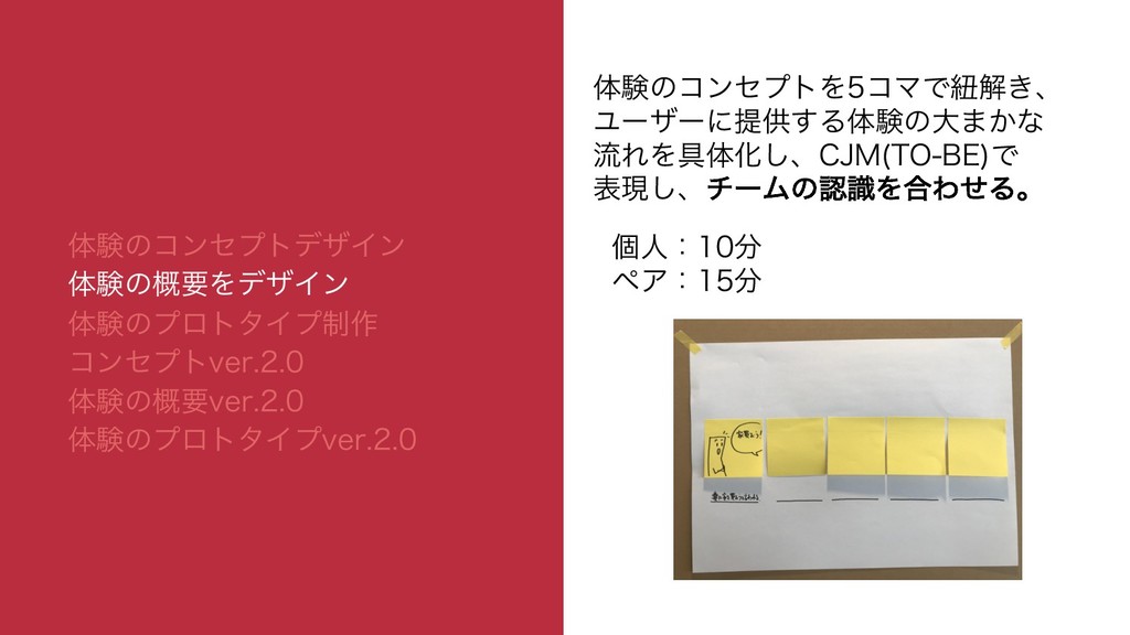 ମݧͷίϯηϓτΛίϚͰඥղ͖ɺ Ϣʔβʔʹఏڙ͢Δମݧͷେ·͔ͳ ྲྀΕΛ۩ମԽ͠ɺ$+. 50#& Ͱ දݱ͠ɺνʔϜͷೝࣝΛ߹ΘͤΔɻ ݸਓɿ ϖΞɿ ମݧͷίϯηϓτσβΠϯ ମݧͷ֓ཁΛσβΠϯ