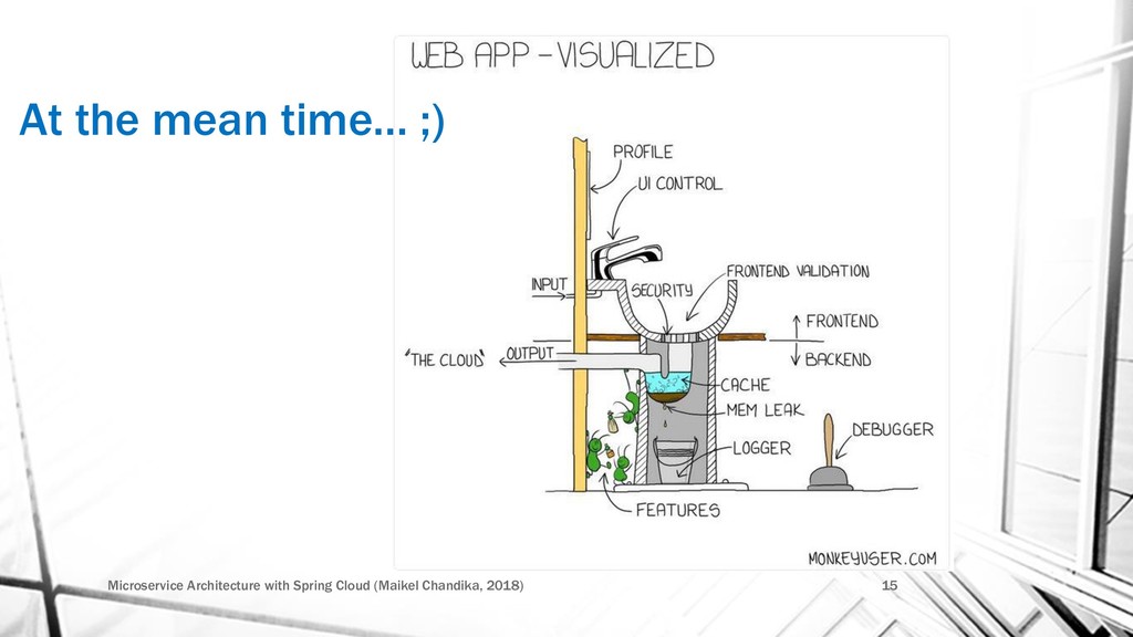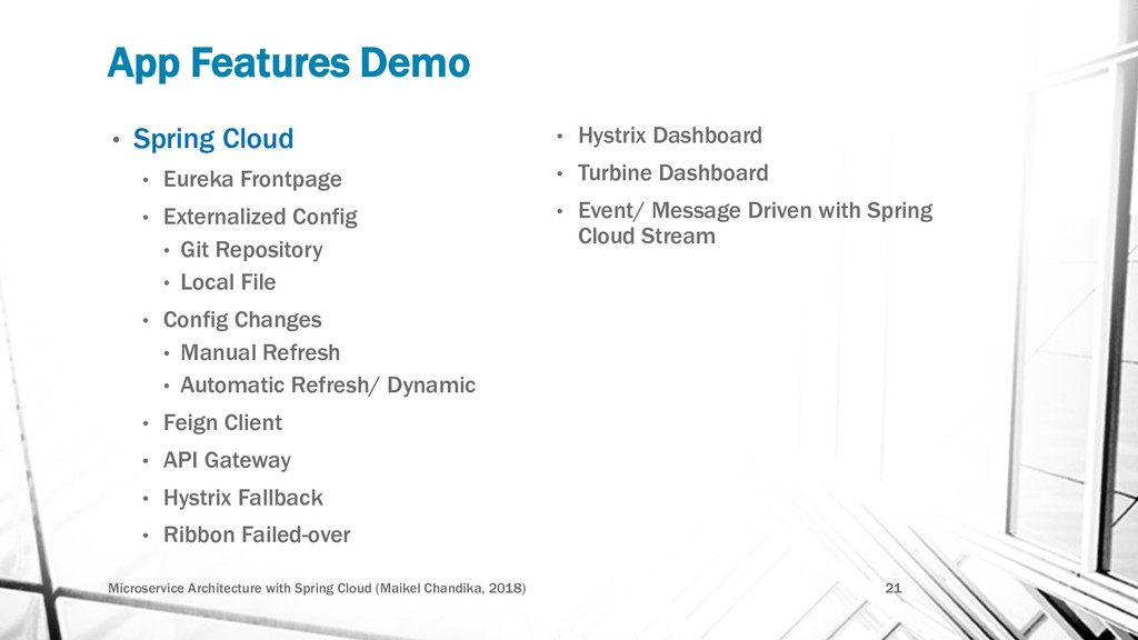 and reduce boilerplate code. • Spring Config Server Externalize Configuration • Netflix Eureka Service Discovery/ Dynamic Service Registration, mid-tier load balancing & failover. • Netflix Zuul Service Proxy/ Gateway API. • Netflix Hystrix Circuit Breaker / Self Healing • Netflix Ribbon Inter Process Communication (remote procedure calls) library with built in load balancers. • Feign Declarative HTTP Client Microservice Architecture with Spring Cloud (Maikel Chandika, 2018) 14 And many more….