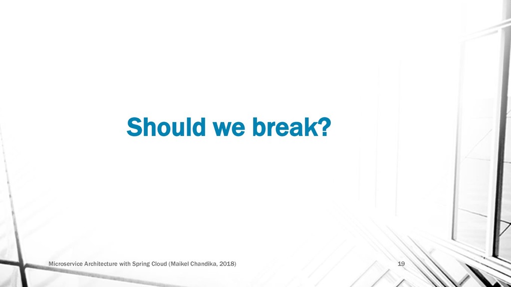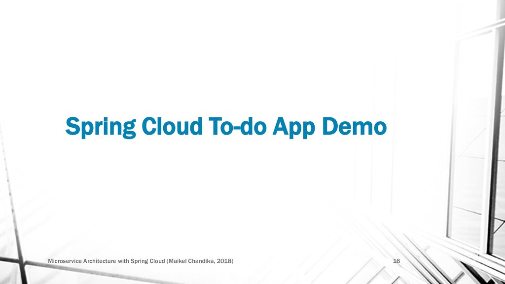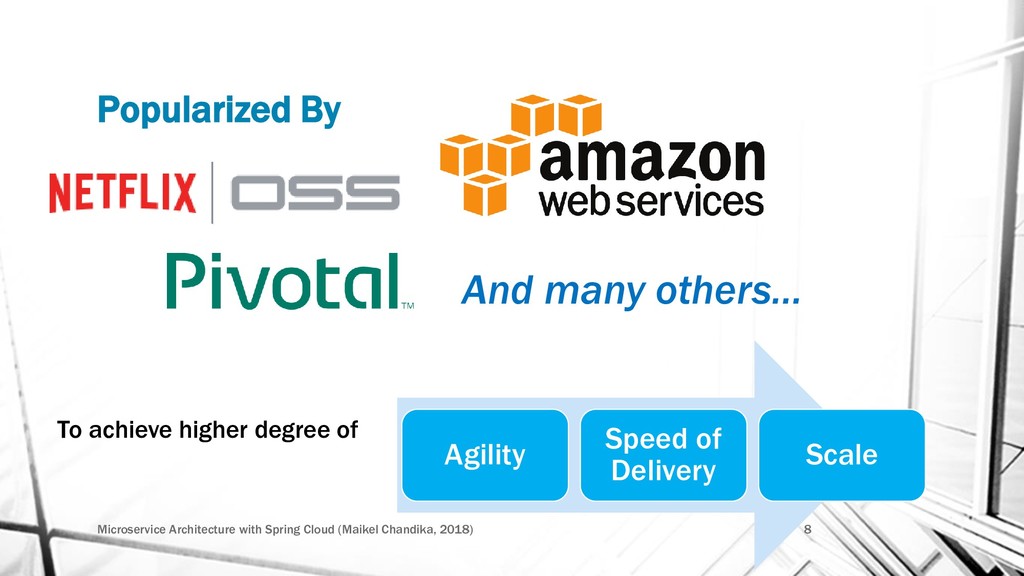 to quickly penetrate the market • No longer interested developing consolidated & managing end-to-end business functions. • To be more agility, speed of delivery, and scale to compete market. • Technology • Emergence of HTML5, CSS3, Client-side JavaScript framework, mobile platform & apps. • Revolutionized space of the database, NoSQL. • Infrastructure Management, PaaS, Container revolution & orchestration. Microservice Architecture with Spring Cloud (Maikel Chandika, 2018) 7