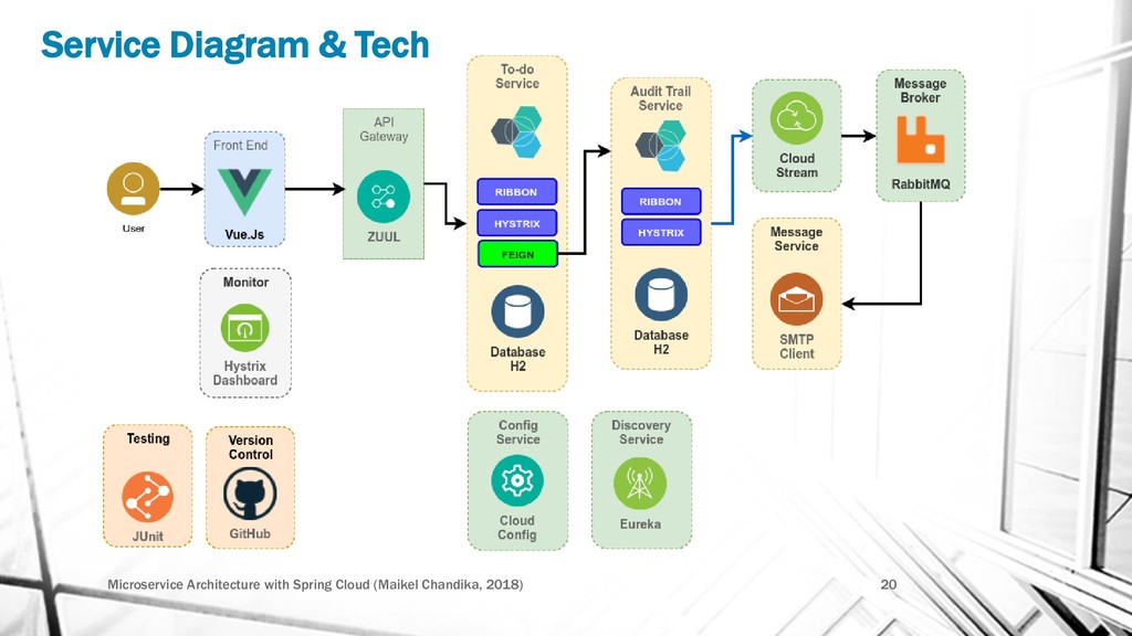 Discovery Service • Business Domain • To-do Service • Audit Trail Service • Integration Domain • Message Service • Front End • Vue.Js Microservice Architecture with Spring Cloud (Maikel Chandika, 2018) 18