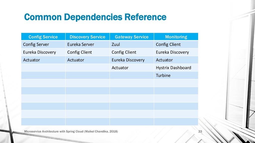 • Swagger & Web UI • H2 Web Console • HATEOAS • WebTools • Project Starter • Web (http://start.spring.io) • IntelliJ IDEA • And many more… Microservice Architecture with Spring Cloud (Maikel Chandika, 2018) 22