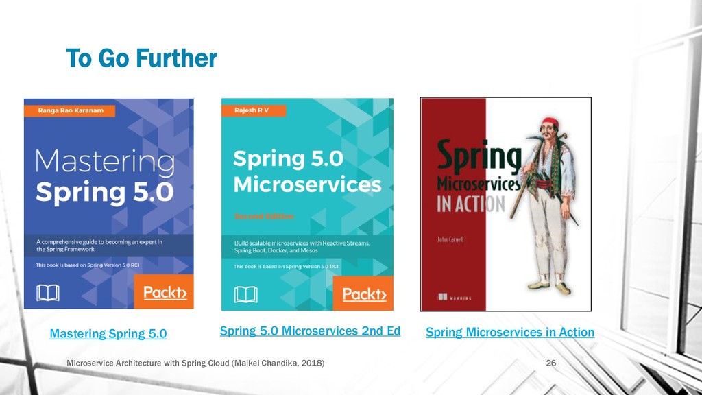 • Developing distributed system can be complex (request & latency) • Deploying microservice can be complex (coordination). • Testing of application are harder. Microservice Architecture with Spring Cloud (Maikel Chandika, 2018) 25
