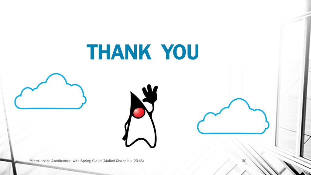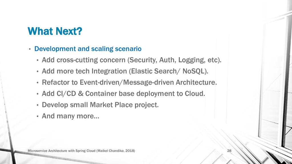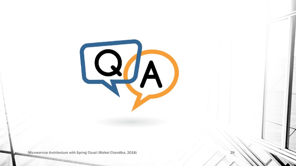 concern (Security, Auth, Logging, etc). • Add more tech Integration (Elastic Search/ NoSQL). • Refactor to Event-driven/Message-driven Architecture. • Add CI/CD & Container base deployment to Cloud. • Develop small Market Place project. • And many more… Microservice Architecture with Spring Cloud (Maikel Chandika, 2018) 28
