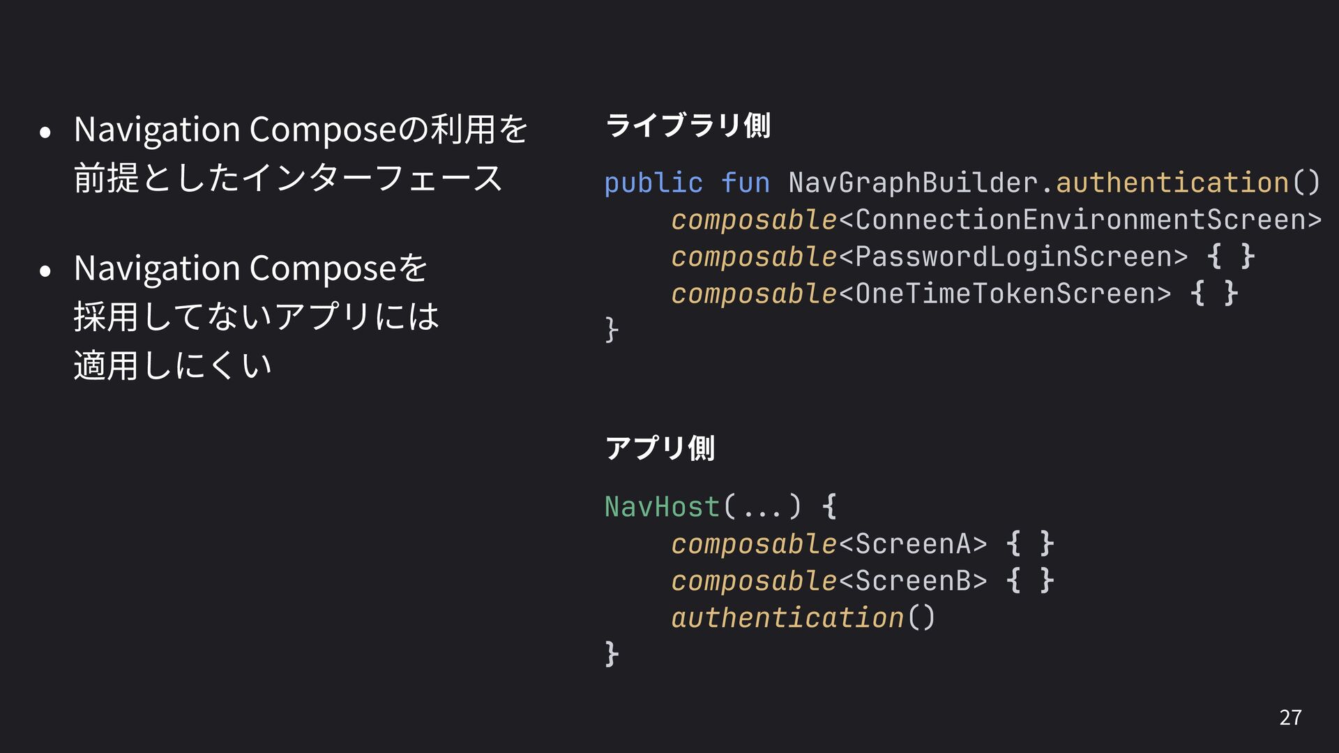 String, private val httpClient: OkHttpClient, ) { public constructor(apiKey: String) : this( apiKey = apiKey, httpClient = OkHttpClient.Builder() .addInterceptor(MyInterceptor()) .build(), ) } ← 内部実装 用 ← 利 用 者 用 ← シンプルに ライブラリ側 アプリ側 val client = MyApiClient(apiKey = "your_api_key")