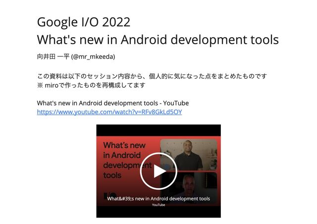 Google I/O 2022 What's new in Android development tools の個人的な気になりポイントまとめです。 社内のGoogle I/O 報告LT会で発表した資料になります。