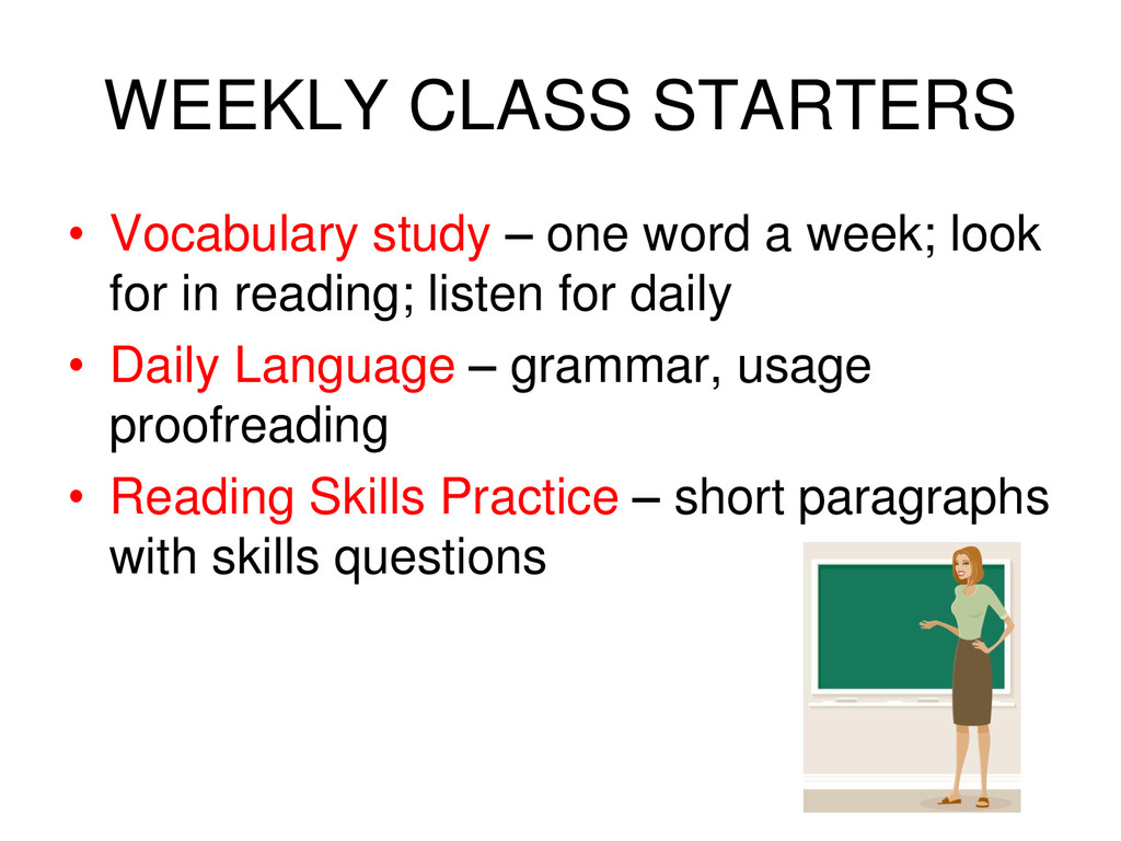 week; look for in reading; listen for daily • Daily Language – grammar, usage proofreading • Reading Skills Practice – short paragraphs with skills questions