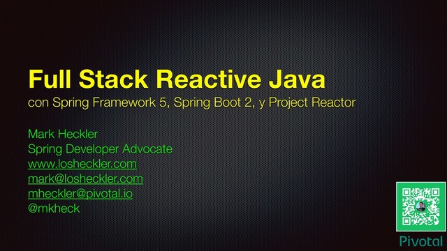 Programación reactiva ofrece desarrolladores de Java la habilidad de construir servicios elásticos, responsivos, y dirigidos por mensajes...pero muchos desarrolladores de Java no saben donde empezar. La iniciativa "Reactive Streams" nos provee una base y el proyecto Reactor nos da una manera excelente para que nos hagamos inmediatamente productivos por aprovechar las capacidades reactivas de principio a fin. Si tiene experiencia con sistemas Spring MVC *o* sistemas "funcionales", Reactor le dará el poder para crear rápidamente y eficientemente aplicaciones reactivas de Spring Boot 2.
