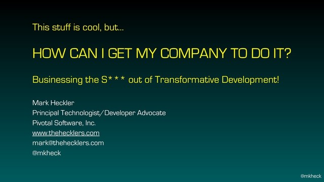 Cloud Native, containers, DevOps, microservices, and more: we go to conferences and get excited about the potential of so many things that could revolutionize our development and change our organizational and professional lives! And then, we go home...and hit the wall. If you've ever asked yourself, "This stuff is cool, but HOW CAN I GET MY COMPANY TO DO IT??!", this is the session for you.