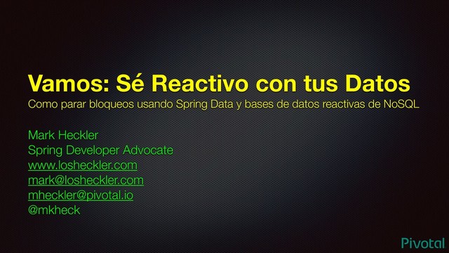 Usando Spring Data y tu favorita base de datos de NoSQL, se puede explotar el poder completo de los sistemas reactivos, incluyendo "al metal". En esta sesión, en ponente discute y compara soporte reactivo para MongoDB, Cassandra, Couchbase, y Redis, y entonces demuestra como usar cada opción en producción por programando _en vivo_ ejemplos del mundo real. Vengas a esta sesión para aumentar tu nivel y terminar bloqueos!