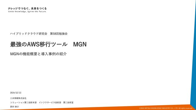 10 Windows Windows Server 2022 (64bit) Windows Server 2019 (64bit) Windows Server 2016 (64bit) Windows 10 (64bit) Windows Server 2012, 2012 R2 (64bit) Windows Server 2008, 2008 R2 (64bit) Windows Server 2008 (32bit) Windows Server 2003, 2003 R2 (64bit) Windows Server 2003, 2003 R2 (32bit) Linux Red Hat Enterprise Linux(RHEL) 5.5~9.0 Ubuntu LTS 12.04~24.04 CentOS 5.5~7.9 Oracle Linux (OL) 6.0~7.0、8.5~8.9 Debian Linux 8~11 Rocky Linux 8, 9 SUSE Linux Enterprise Server 11 SP4 ~ 15 SP5 Hyper-V/VMware/物理 問わず、MGNによる移行に対応。 MGNが対応するOSは下記の通り。 12/11時点で、Windows11, Windows Server 2025のMGNサポートは発表されていない。 https://docs.aws.amazon.com/ja_jp/mgn/latest/ug/Supported-Operating-Systems.html#Supported-Operating-Systems-List-windows https://docs.aws.amazon.com/ja_jp/mgn/latest/ug/Supported-Operating-Systems.html#Supported-Operating-Systems-List-linux