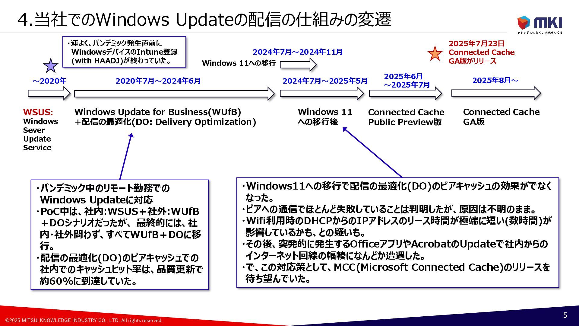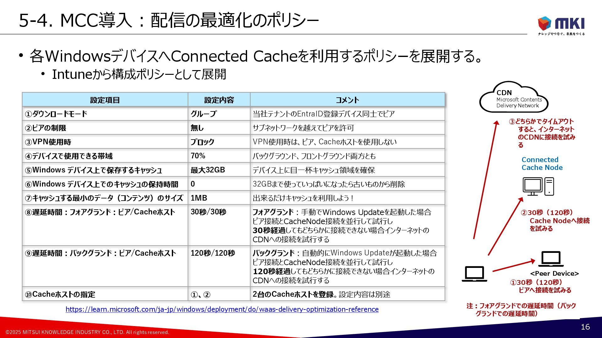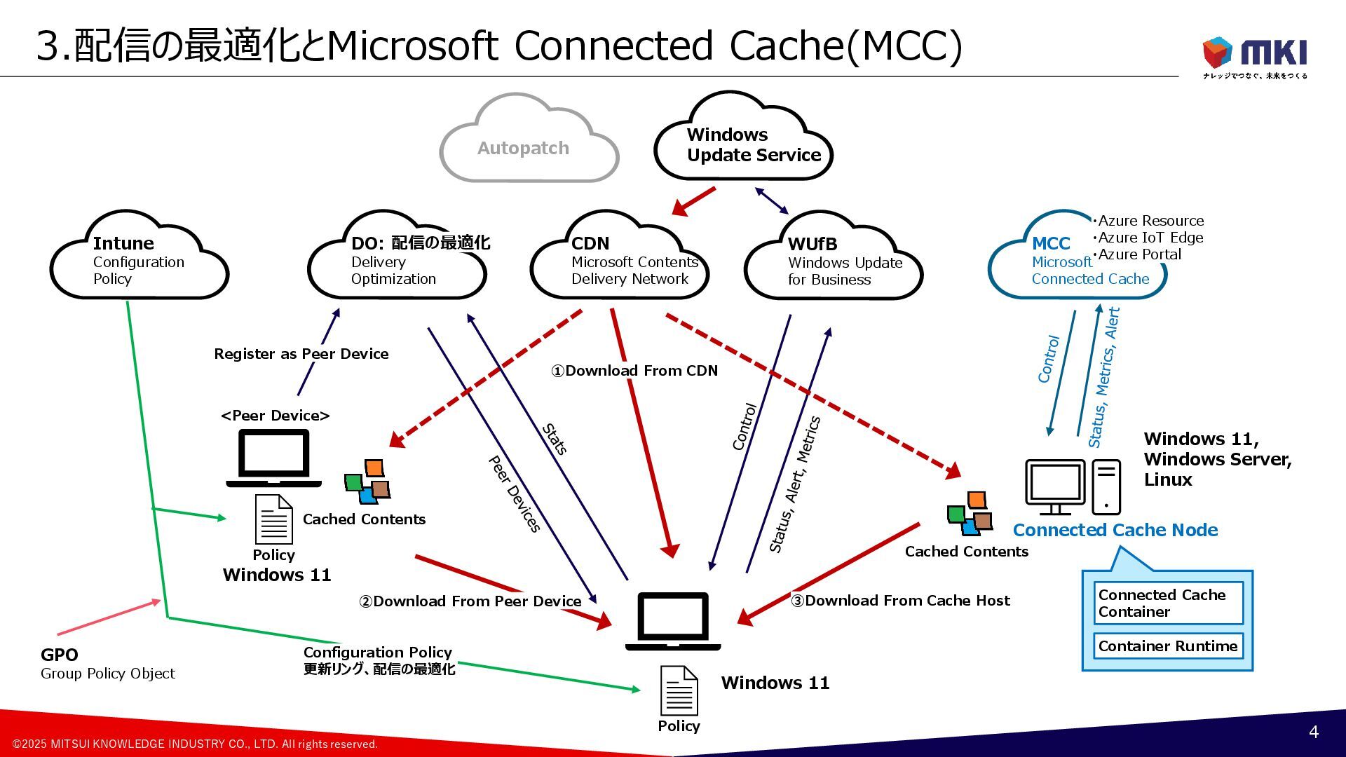 Connected Cache(MCC) 4 CDN Microsoft Contents Delivery Network WUfB Windows Update for Business Intune Configuration Policy GPO Group Policy Object Policy ①Download From CDN Configuration Policy 更新リング、配信の最適化 Windows 11 DO: Delivery Optimization 配信の最適化 Policy <Peer Device> ②Download From Peer Device Register as Peer Device Cached Contents Windows 11 MCC Microsoft Connected Cache Connected Cache Node ③Download From Cache Host Cached Contents Windows 11, Windows Server, Linux ・Azure Resource ・Azure IoT Edge ・Azure Portal Connected Cache Container Container Runtime Windows Update Service Autopatch