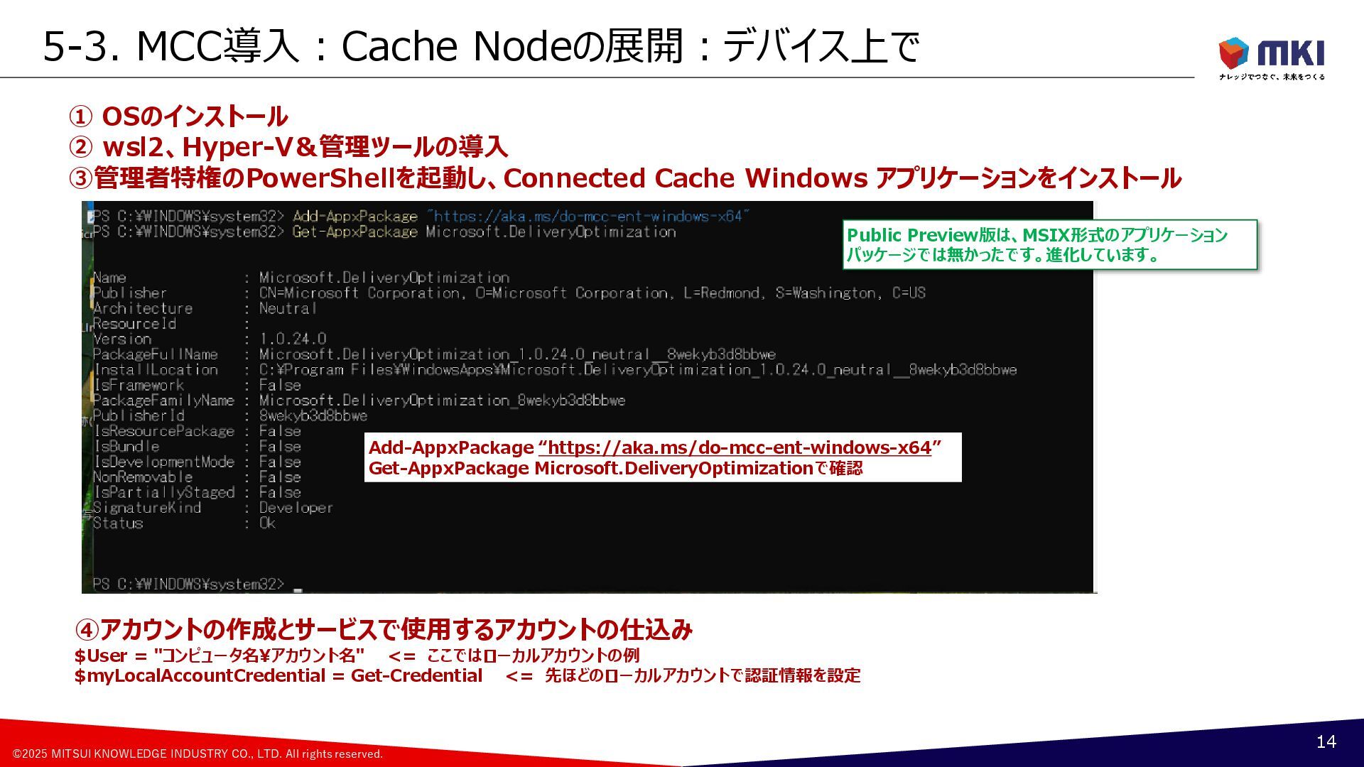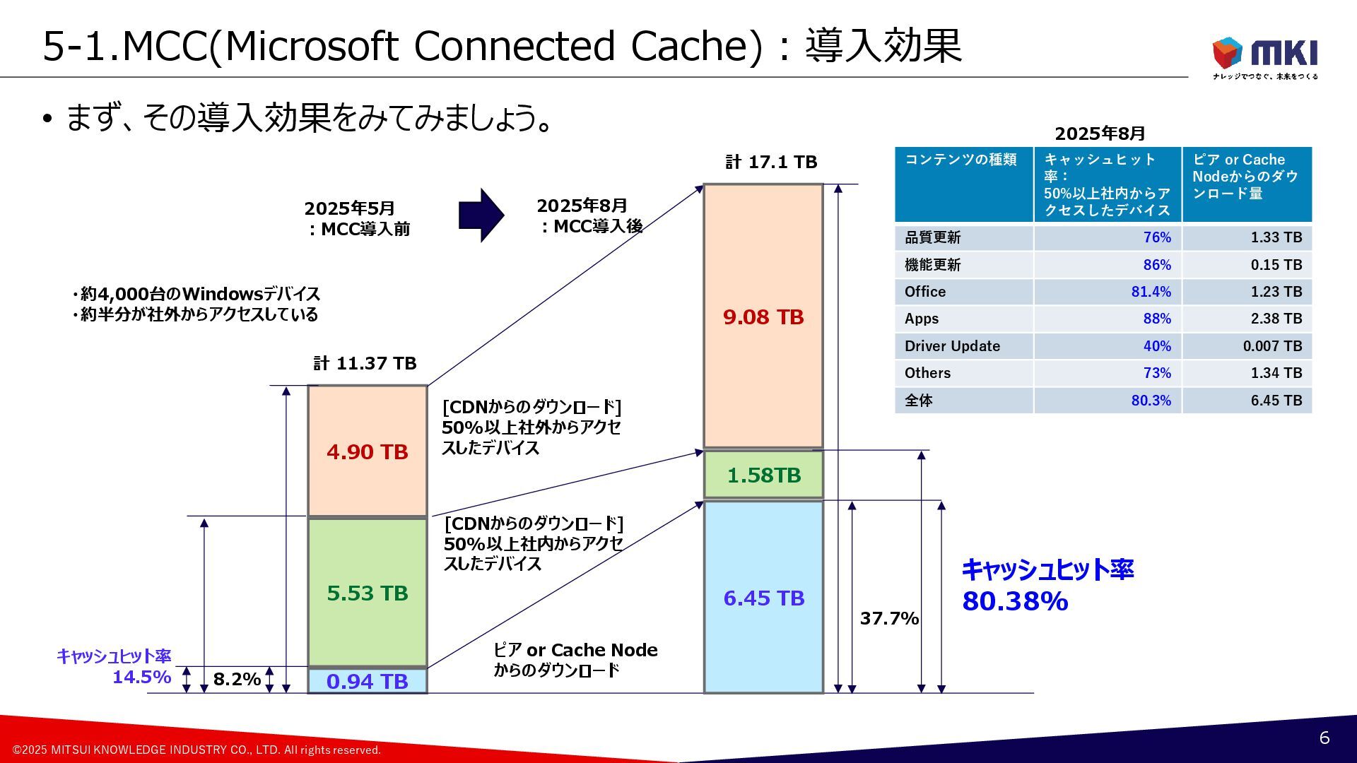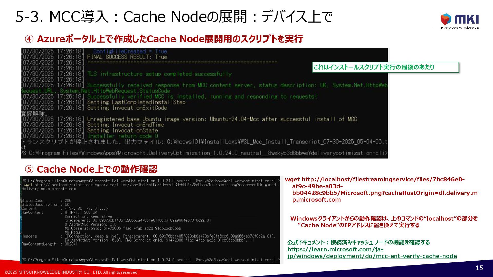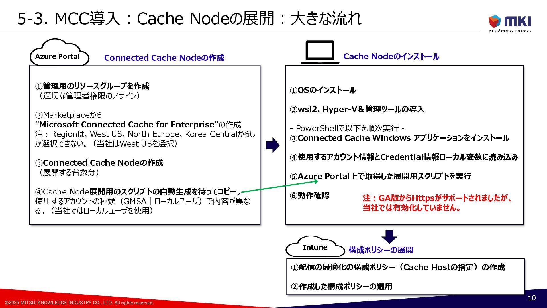 Connected Cache(MCC) 4 CDN Microsoft Contents Delivery Network WUfB Windows Update for Business Intune Configuration Policy GPO Group Policy Object Policy ①Download From CDN Configuration Policy 更新リング、配信の最適化 Windows 11 DO: Delivery Optimization 配信の最適化 Policy <Peer Device> ②Download From Peer Device Register as Peer Device Cached Contents Windows 11 MCC Microsoft Connected Cache Connected Cache Node ③Download From Cache Host Cached Contents Windows 11, Windows Server, Linux ・Azure Resource ・Azure IoT Edge ・Azure Portal Connected Cache Container Container Runtime Windows Update Service Autopatch