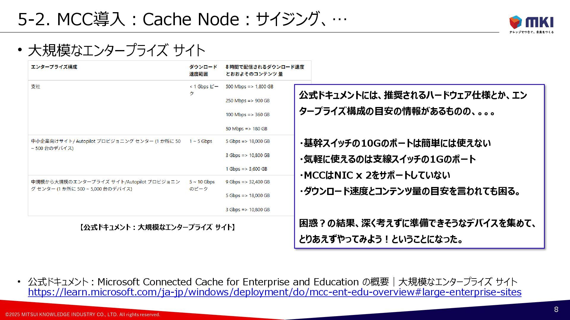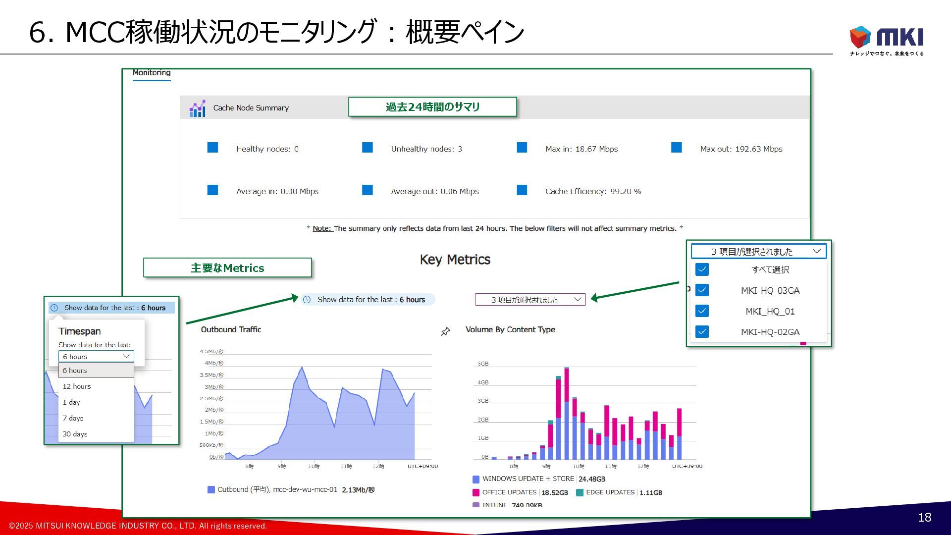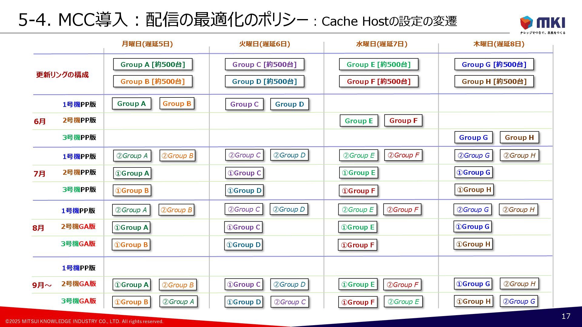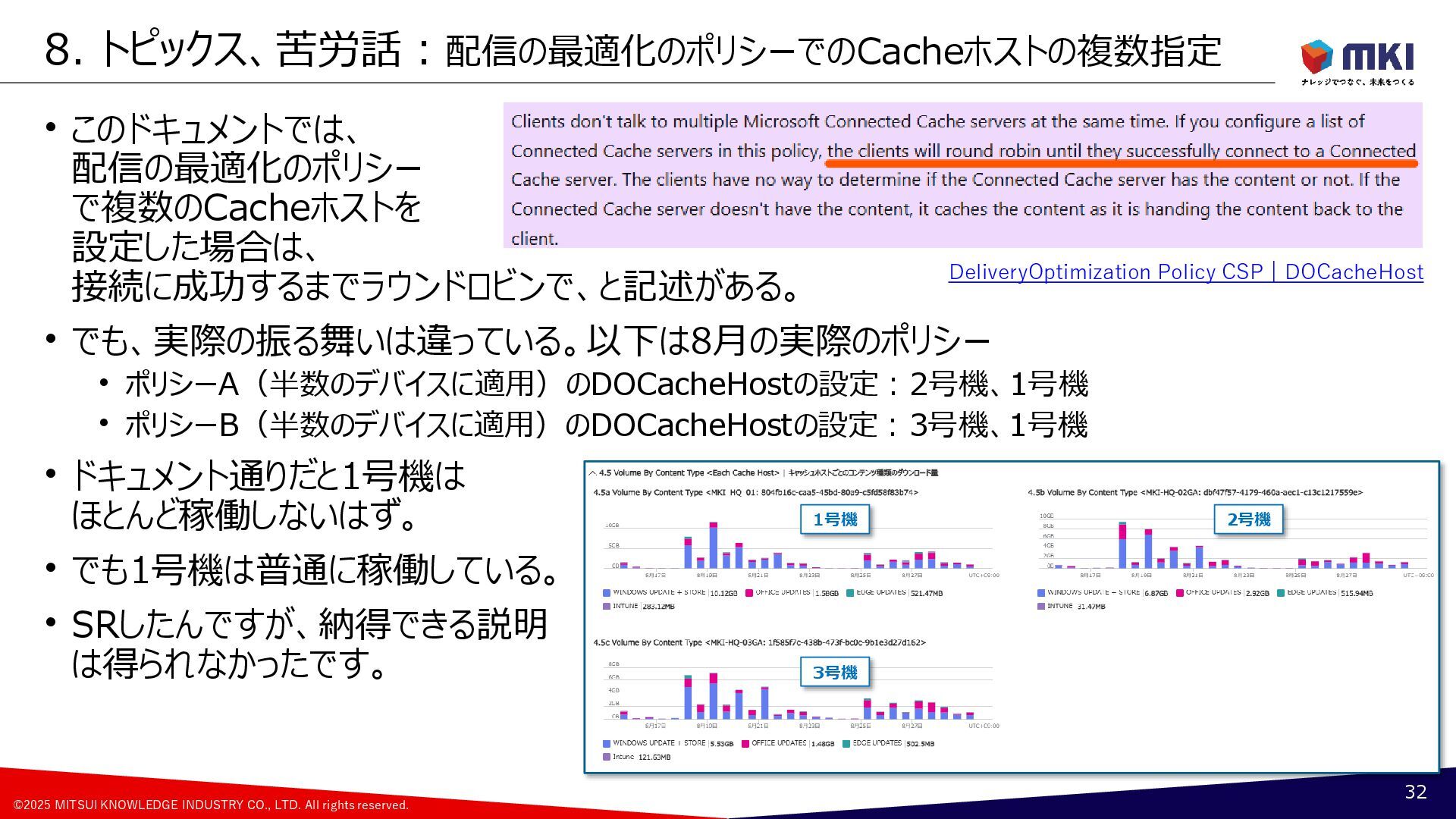 MCC導入:配信の最適化のポリシー:Cache Hostの設定の変遷 17 Group A [約500台] Group B [約500台] Group C [約500台] Group D [約500台] Group F [約500台] Group G [約500台] Group H [約500台] Group E [約500台] 月曜日(遅延5日) 火曜日(遅延6日) 水曜日(遅延7日) 木曜日(遅延8日) 更新リングの構成 1号機PP版 2号機PP版 3号機PP版 6月 Group A Group B Group C Group D Group G Group H Group F Group E 1号機PP版 2号機PP版 3号機PP版 7月 ②Group A ②Group B ①Group A ①Group B ②Group C ②Group D ①Group C ①Group D ②Group F ②Group E ①Group F ①Group E ②Group G ②Group H ①Group G ①Group H 1号機PP版 2号機GA版 3号機GA版 8月 ②Group A ②Group B ①Group A ①Group B ①Group C ①Group D ②Group F ②Group E ①Group F ①Group E ②Group G ②Group H ①Group G ①Group H ②Group C ②Group D 1号機PP版 2号機GA版 3号機GA版 9月~ ②Group A ②Group B ①Group A ①Group B ①Group C ①Group D ②Group F ②Group E ①Group F ①Group E ②Group G ②Group H ①Group G ①Group H ②Group C ②Group D