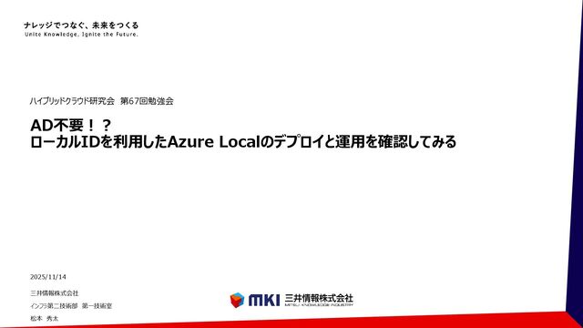 ハイブリッドクラウド研究会 第67回勉強会 AD不要!? ローカルIDを利用したAzure Localのデプロイと運用を確認してみる 三井情報株式会社 インフラ第二技術部 第一技術室 松本 秀太