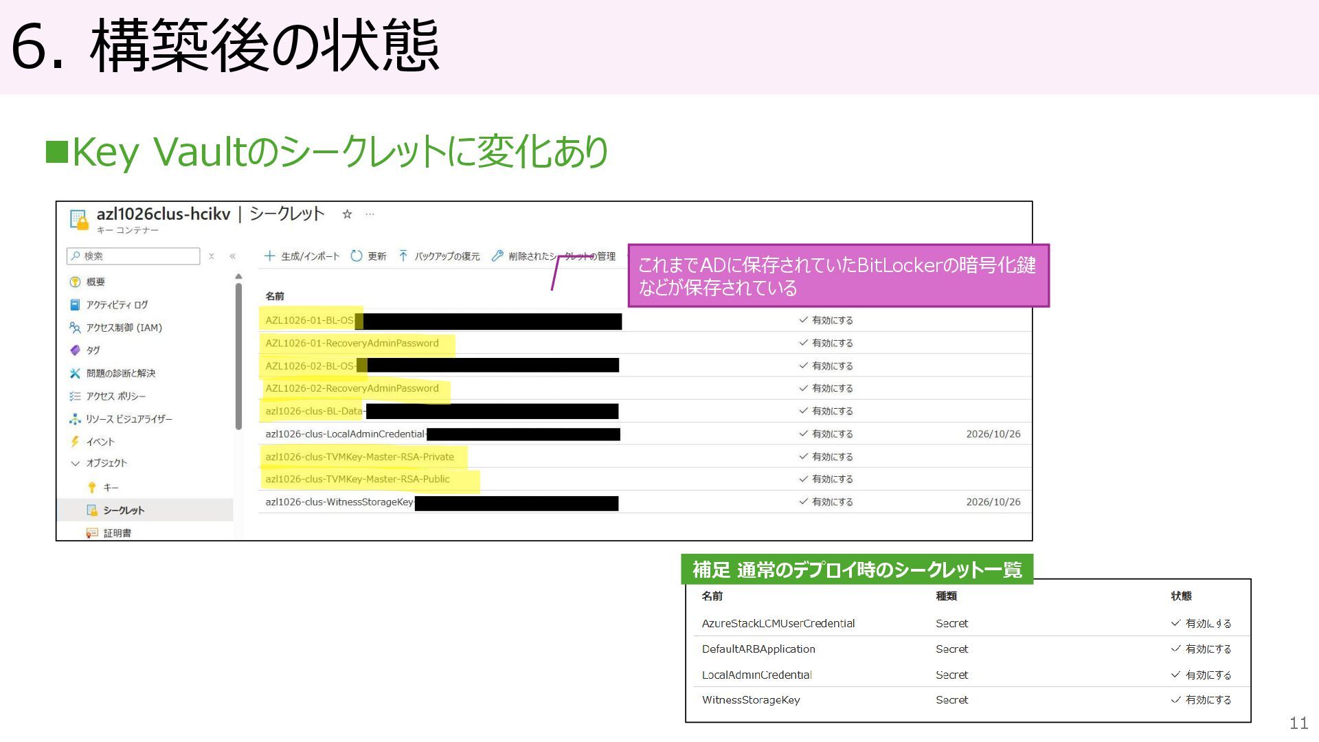 6. 構築後の状態 11 ◼Key Vaultのシークレットに変化あり 補足 通常のデプロイ時のシークレット一覧 これまでADに保存されていたBitLockerの暗号化鍵 などが保存されている